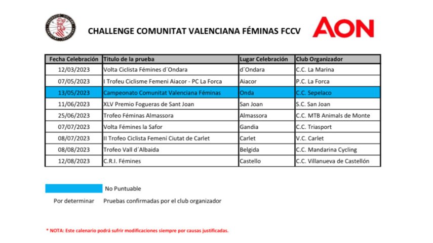 La FCCV ha actualizado el calendario de competición de la CHALLENGE COMUNITAT VALENCIANA FÉMINAS AÓN. Este domingo, 7 de mayo, se disputa el Trofeu Ciclisme Femeni Aiacor– PC LA Forca.
