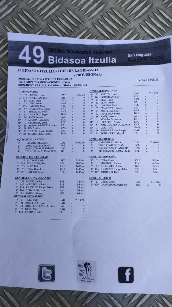 En las rampas del Jaizkibel, con dos minutos de ventaja, Dani Cepa se iba con Montoli, Krawiec y Rodríguez. Pasaron juntos por el alto, pero el pelotón apretó atrás y les dio caza en los últimos metros. En el esprint, el británico Louis Sutton mostró su velocidad para ganar la etapa y vestirse de líder.