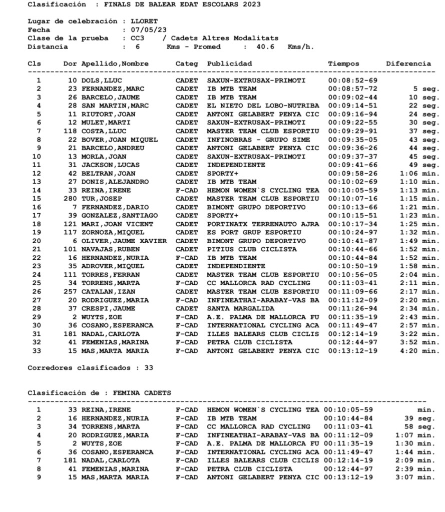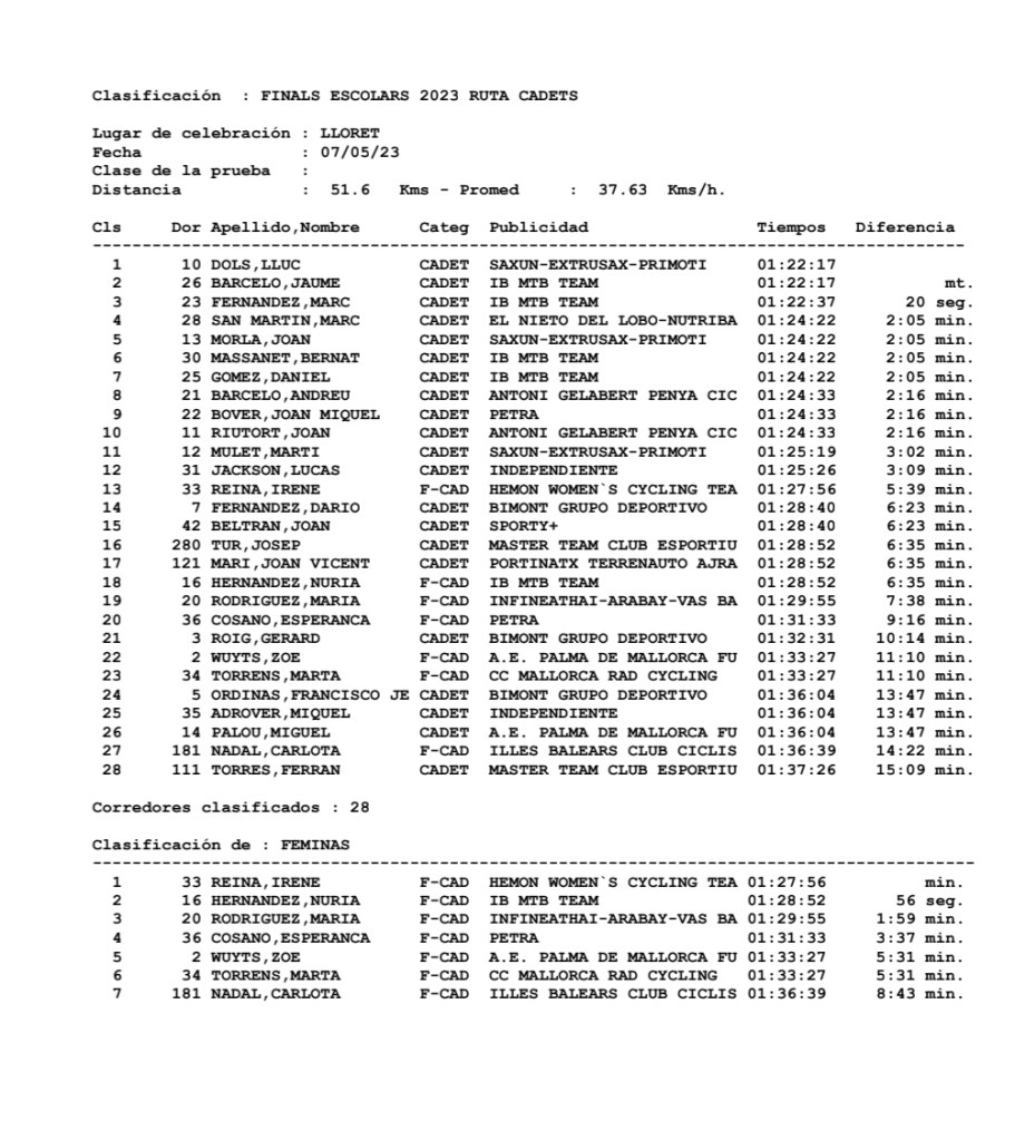 Jornada redonda para corredor del Saxun Extrusax Primoti Lluc Dolçs. Este fin de semana se ha proclamado campeón autonómico de Baleares tanto en la prueba en ruta como en la de contrarreloj individual disputadas en Lloret. En la primera, Jaume Barceló (IB MTB Team) fue segundo y Marc Fernández (IB MTV Team), tercero. Quinta plaza para Joan Murla (Saxun). En la CRI, volvió a ser el mejor y tuvo a su lado a Marc Fernández y Jaume Barceló, que intercambiaron los puestos en el podio con relación a la de línea.