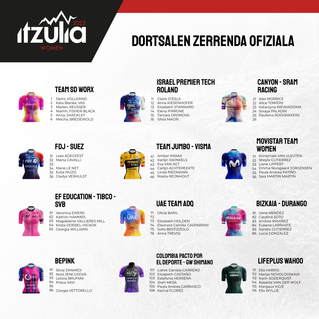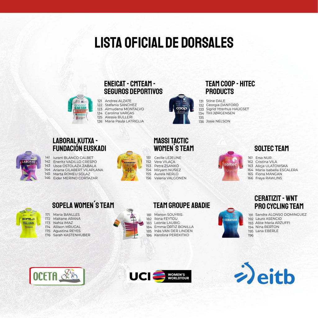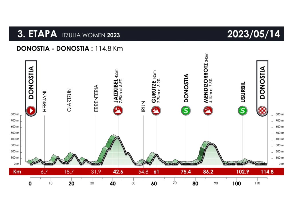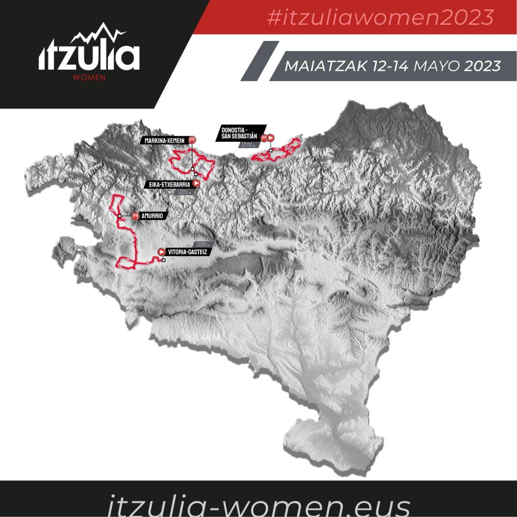 Hoy viernes, día 12 de mayo, comienza segunda edición de la Itzulia-Women, que contará con tres etapas, en Etxebarria con una jornada de 122.2 kilómetros que concluirá en Markina-Xemein tras un recorrido de media montaña con subidas a Gontzagarraigana (3.ª cat., 2.6 km al 6.5 %) y a Urkaregi (2.ª cat., 5.8 km al 4.6 %). La segunda etapa tendrá 133.2 kilómetros entre Vitoria-Gasteiz y Amurrio, con un recorrido rompepiernas en el que las subidas puntuables serán a La Tejera (3.ª cat., 3 km al 6.5 %) y a Malkuartu (3.ª cat., 3.3 km al 4.7 %). La última etapa, el domingo, emulará el recorrido de la Donostiako Klasikoa con 114.8 kilómetros y subidas a Jaizkibel (1.ª cat., 7.9 km al 5.6 %) y Mendizorrotz (2.ª cat., 4.1 km al 7.3 %), con salida y llegada en la capital gipuzkoana.