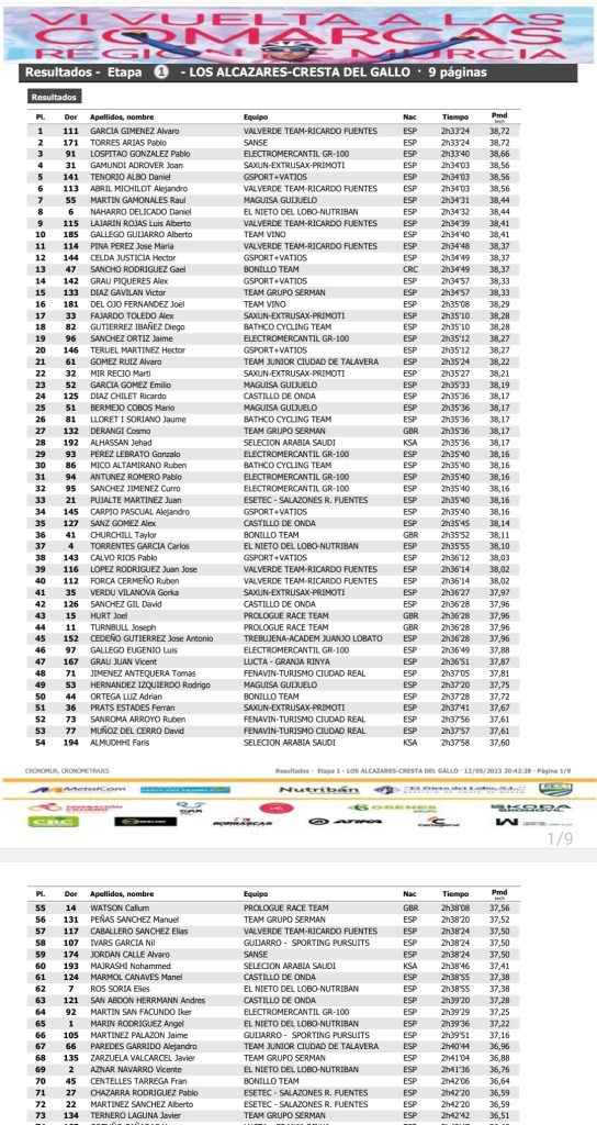 Álvaro García (Valverde Team) se ha impuesto hoy en la Cresta del Gallo en la primera etapa de la VI Vuelta a las Comarcas Región de Murcia para corredores júniors que ha partido de Los Alcázares y ha contado con 100,5 kilómetros de recorrido. Ha batido al esprint a su compañero de fuga Pablo Torres (Sanse). Pablo Lospitao (Electromercantil) ha entrado en tercera posición y el corredor del Saxun Extrusax Primoti, Joan Gamundi, firma la cuarta plaza.