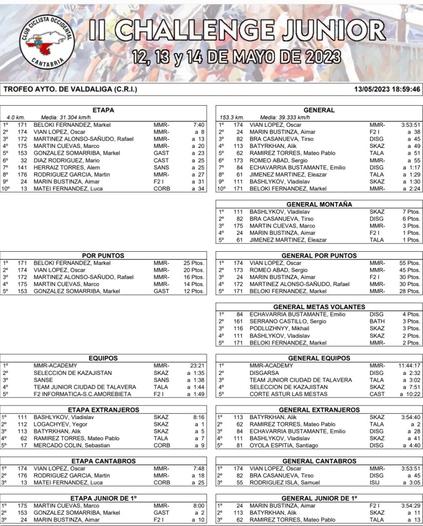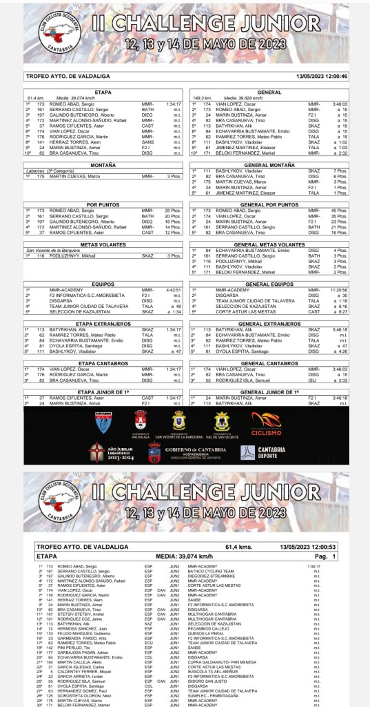 Sergio Romeo (MMR-Academy), con Sergio Serrano (Bathco Team) segundo, y Markel Beloki (MMR-Academy) se han impuesto hoy en los dos sectores que se han disputado en la II Challenge Júnior Cantabria, el segundo en la modalidad de CRI. Óscar Vian López (MMR-Academy) mantiene el amarillo que logró en la primera jornada a falta de una etapa.