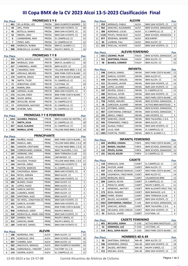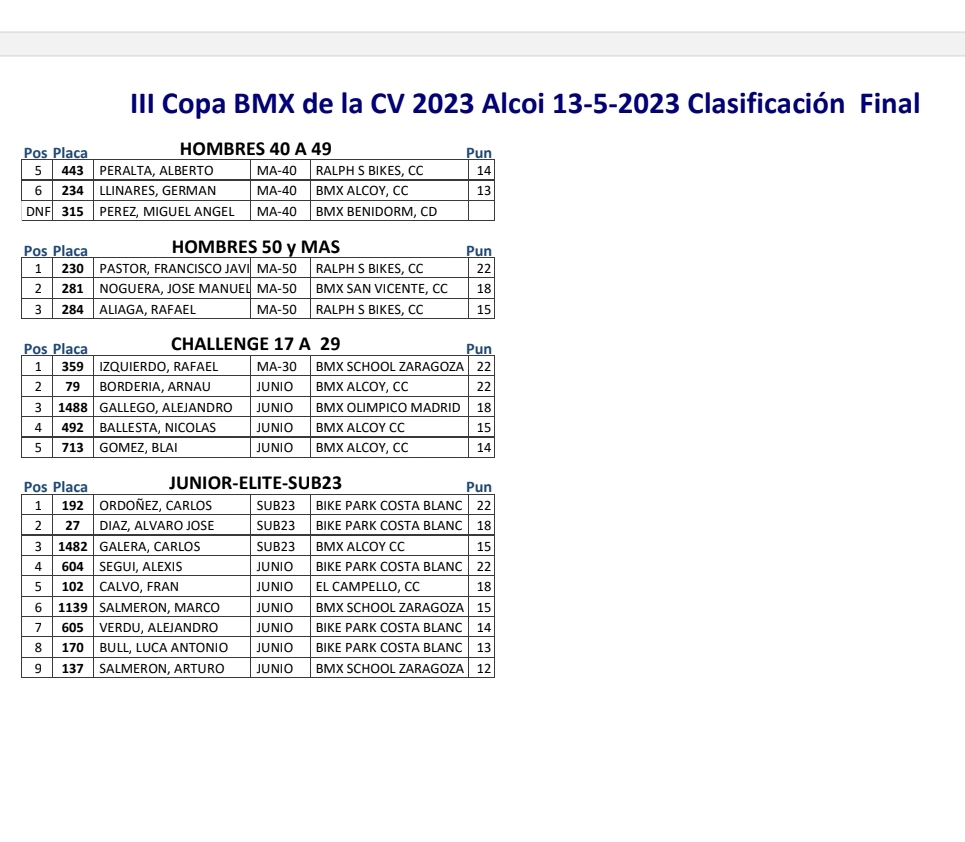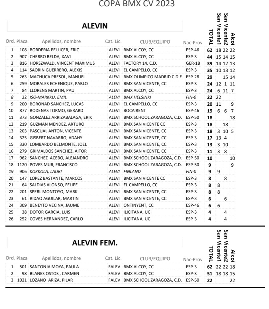 Tras esta jornada, lideran la Copa BMX de la Comunidad Valenciana 2023: Eric Bordería (BMX Alcoy), Paula Santonja (BMX Alcoy), Rodrigo Manuel Díaz (Bike Park Costa Blanca), Sofía Belén Bull (Bike Park Costa Blanca), Blai Gómez (BMX Alcoy), Álvaro José Díaz (Bike Park Costa Blanca), Kamil Goovaerts, Antonio Salido, Enrique Santonja (BMX Alcoy), Francisco Javier Pastor, Daniel García (Bike Park Costa Blanca), Chiara Muñoz (Bike Park Costa Blanca), Alexis Segui (Bike Park Costa Blanca), Mario Botella (BMX San Vicente), Fabiola Contamina, Rafael Izquierdo, Hugo Martín (Bike Park Costa Blanca), Carla Lozano (BMX Alicante), Mateo Javier Nieto y Priscila Álvarez.