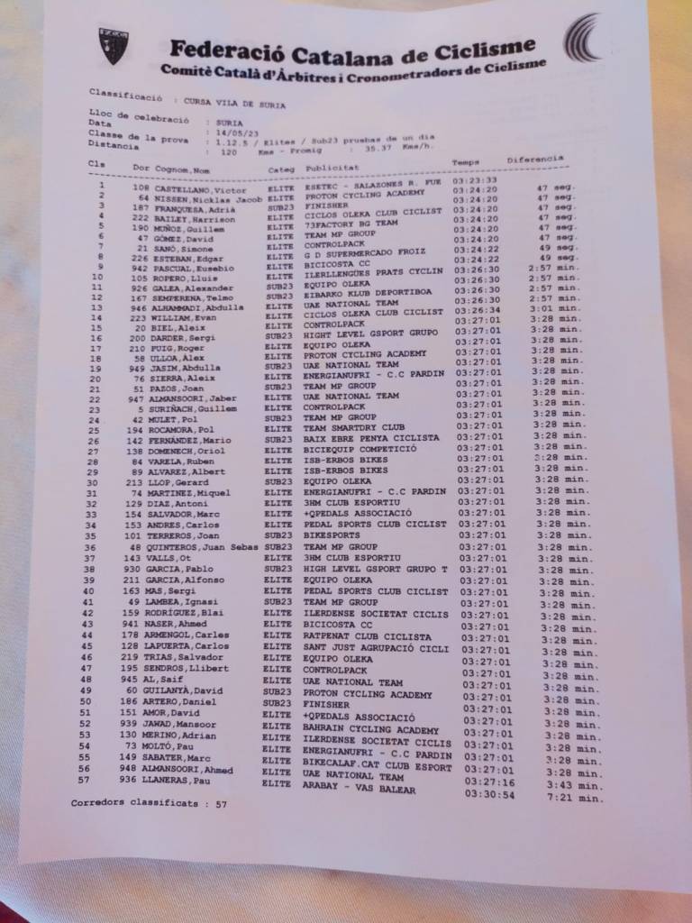 Víctor Castellano se ha estrenado hoy con el maillot del Esetec Salazones Ricardo Fuentes conquistando la 7ª Cursa Ciclista Vila de Súria, competición puntuable para las Grans Clássiques-7º Trofeu Joan Casadevall. Castellano ha recorrido los 120 kilómetros de la jornada en tres horas, 23 minutos y 33 segundos. A47 segundos ha entrado un grupo de ocho corredores encabezado por Jacob Nicklas Nissen (Froton Cycling) y Adriá Franquesa (Finisher). Novena plaza para Eusebio Pascual (Bahrain Cycling Acamemy) .