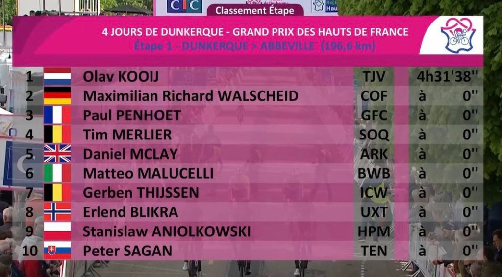 Olav Kooij (Jumbo Visma) ha sido el ganador de la primera etapa de los 4 Jours de Dunkerque que ha finalizado en Abbeville tras 196,6 kilómetros de recorrido. El holandés levantó los brazos frente al alemán Max Walscheid (Cofidis), el francés Paul Penhoët (Groupama-FDJ) y el belga Tim Merlier (Soudal Quick-Step). Esta final estuvo marcada por una gran caída en los últimos 500 metros, donde Arnaud De Lie (Lotto Dstny) se marchó al suelo.
