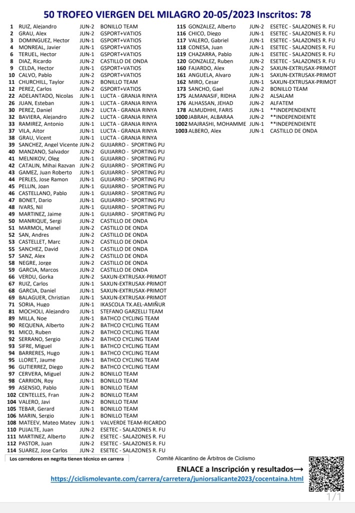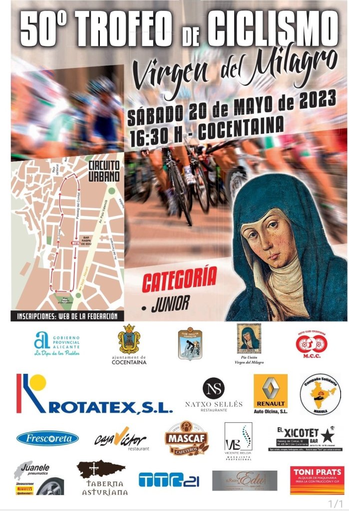 El Trofeo de Ciclismo Virgen de Milagro de Cocentaina cumple sus bodas de oro con una edición que disputará el sábado, 20 de mayo en un circuito urbano diseñado en el Passeig del Comtat y en el que competirá en esta ocasión el pelotón júnior. Se espera una gran participación (78 inscritos) y la presencia de los tres equipos alicantinos: Lucta-Gtranja Rinya, Guijarro Sporting Pursuits y Saxun Extrusax Primoti. El Club Ciclista Contestano, organizador de la prueba, ha diseñado para la ocasión un circuito urbano por el Passeig del Comtat de la localidad alicantina.