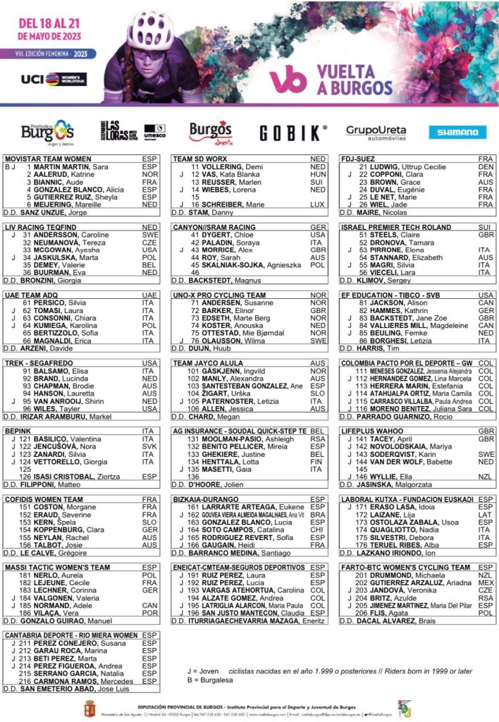 Participan 22 equipos escuadras y el pelotón de la ronda castellana figuran Susana Pérez Conejero (Cantabria Deporte), Sofía Rodríguez (Bizkaia Durango), Alba Teruel (Laboral Kutxa) y Pilar Jiménez (Farto).