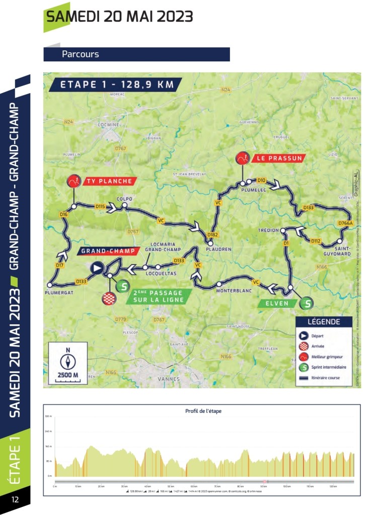 La prestigiosa competición se inaugurará el sábado con una prueba en línea de 128,9 kilómetros con salida a las 13:45 h. desde Grand-Champ y cuya finalización está prevista sobre las 17:00 h. en la misma localidad. La primera etapa estará conformada por varios escollos montañosos y se definirá en un circuito final de casi seis kilómetros ya en Grand-Champ.