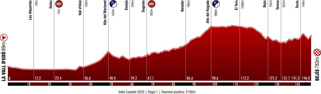 A partir de ahí, la carretera empieza a picar para arriba buscando sumar los 2100 metros de desnivel acumulado, primero con la subida al Alto de Marianet (4’5 kilómetros al 4’8% de pendiente media) y una vez superada la meta volante de Segorbe (km 67) el Alto del Ragudo (4 kilómetros al 4’7% de pendiente media). Será este el punto más alto de la jornada, casi en el kilómetro 100 de carrera, y donde habrá que evaluar cómo llega el pelotón.