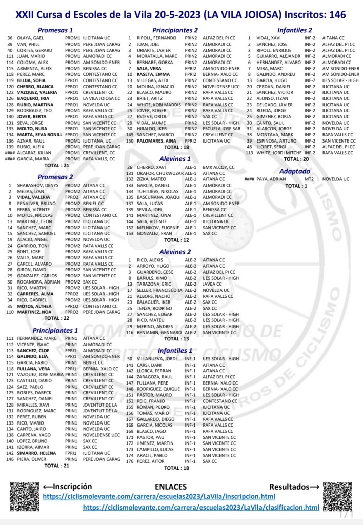 El sábado, día 20 de mayo, se disputa en La Vila la XXII Cursa d’Escoles de Ciclisme, competición que coincide con la segunda prueba de la Liga de Féminas de la Comunidad. Llegan como líderes de la Challenge de Escuelas de la Provincia de Alicante Gael Olaya (UC Ilicitana) y Sofía Belda (CC Contestano), en Promesas 1; Izan Mejías (CC Aitana) y Alma Carreres (Ijes Solar), en Promesas 2; Marc Fernández (CC Aitana) y Vera Fullana (Bernia Xaló), en Principiantes 1; Iker Hiraldo (Sabater) y Aina Palomares (UC Ilicitana), en Principiantes 2; Vicente Sala (UC Ilicitana) y Alexia Vico (UC Novelda), en Alevines 1; Nacho Alborch (Rafa Valls) y Jimena Gas (AM Sonido), en Alevines 2; Mauro Pastor (Ijes Solar) y Adriana Segura (Almoradí), en Infantiles 1; Jorge Rueda (UC Ilicitana) y María Ivars (Bernia Xaló), en Infantiles 2; y Adrián Payá (UC Novelda), en Adaptado MT2. Hay 146 corredores inscritos.