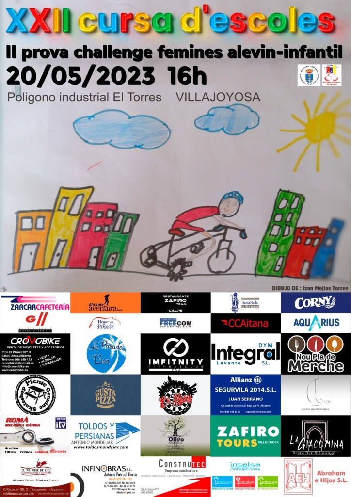La prueba está organizada por el CC Aitana y el cartel anunciador de la carrera cuenta con un dibujo que ha sido diseñado por el corredor de dicha Escuela Izan Mejías. «Los niños presentaron varias pinturas y entre todos eligieron la que más les gustó», comenta el monitor Roque Lloret. El propio Izan, que es líder de la categoría Promesas 2 de la Challenge Alicantina, tras la disputa de seis carreras, explica lo que ha querido expresar en su obra: «Soy yo en bicicleta por Villajoyosa, porque me gusta mucho montar en bici con mis amigos del Aitana».