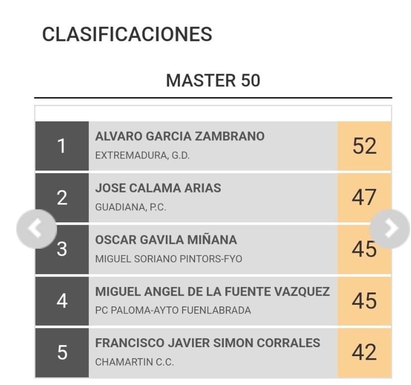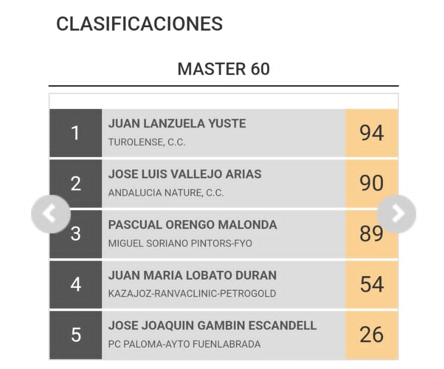 A falta de dos jornadas para el final los corredores del Miguel Soriano Pintors-FYO, Óscar Gavila y Pascual Orengo Malonda luchan por conquistar los maillots de líderes en las categorías Máster 50 y 60, respectivamente. Gavila es tercero con 45 puntos por los 52 de Álvaro García, que comanda la clasificación. Por su parte, Pascual Orengo Malonda cuenta con 89, cinco menos que Juan Lanzuela, que lidera la lista de los M60. Tendrán a su lado su compañeros José Manuel Martínez Bevia para ayudarles.