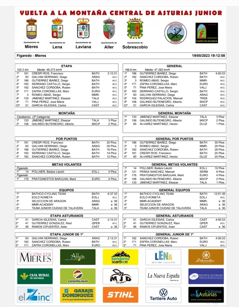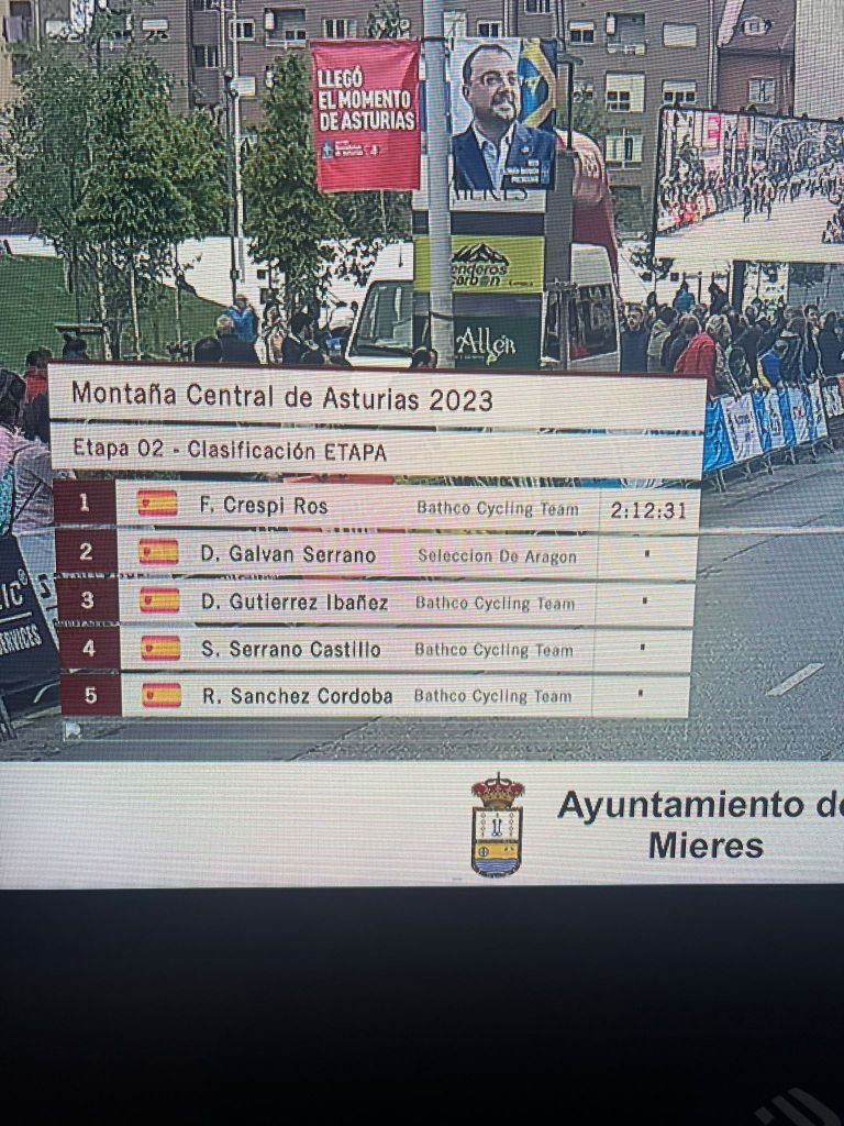 Xisco Crespi (Bathco) ha ganado la segunda etapa de la Vuelta Ciclista Júnior a la Montaña Central de Asturias con final en Mieres por delante de Diego Galvañ (Aragón) y de Diego Gutiérrez (Bathco), que se viste de líder y con el maillot de los puntos. El Bathco Cycling Team es la mejor escuadra de la jornada y de la ronda asturiana. Hoy ha metido a cuatro corredores entre los cinco primeros. Sergio Serrano ha sido cuarto. Héctor Álvarez ha perdido su maillot amarillo después de una jornada para olvidar en el que ha encadenado dos pinchazos y una caída.