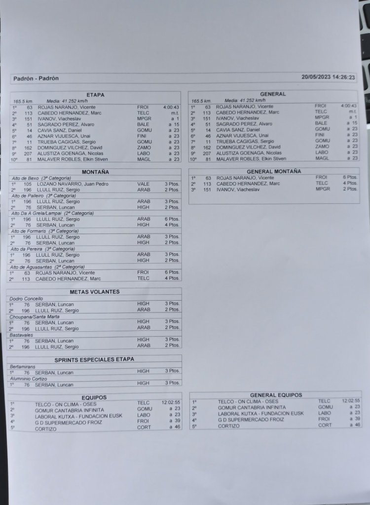 Los protagonistas de la fuga del día han sido Sergio Llull (Arabay) y Luncan Serban (High Level), que tras soltar a sus compañeros de viaje en la subida a Palleiro, se han establecido al frente de la prueba y han llegado a gozar de una importantísima ventaja de más de 7 minutos. Su renta les ha llevado a encarar la ascensión final del día, el Alto de Aguasantas, en cabeza, pero sus duras rampas, que en ocasiones superaban el 10% de pendiente, han terminado condenándoles a ser cazados por Benito (Biciletas Rodríguez Extremadura) y Gabriele Raccagni (Eolo Kometa) y posteriormente por el pelotón. Poco después de su neutralizado, del gran grupo han emergido los tres corredores que han terminado disputándose el triunfo: Vicente Rojas (Supermercados Froiz), Marc Cabedo (Telco’m On Clima Oses) y Viatcheslav Ivanov (MP Group).