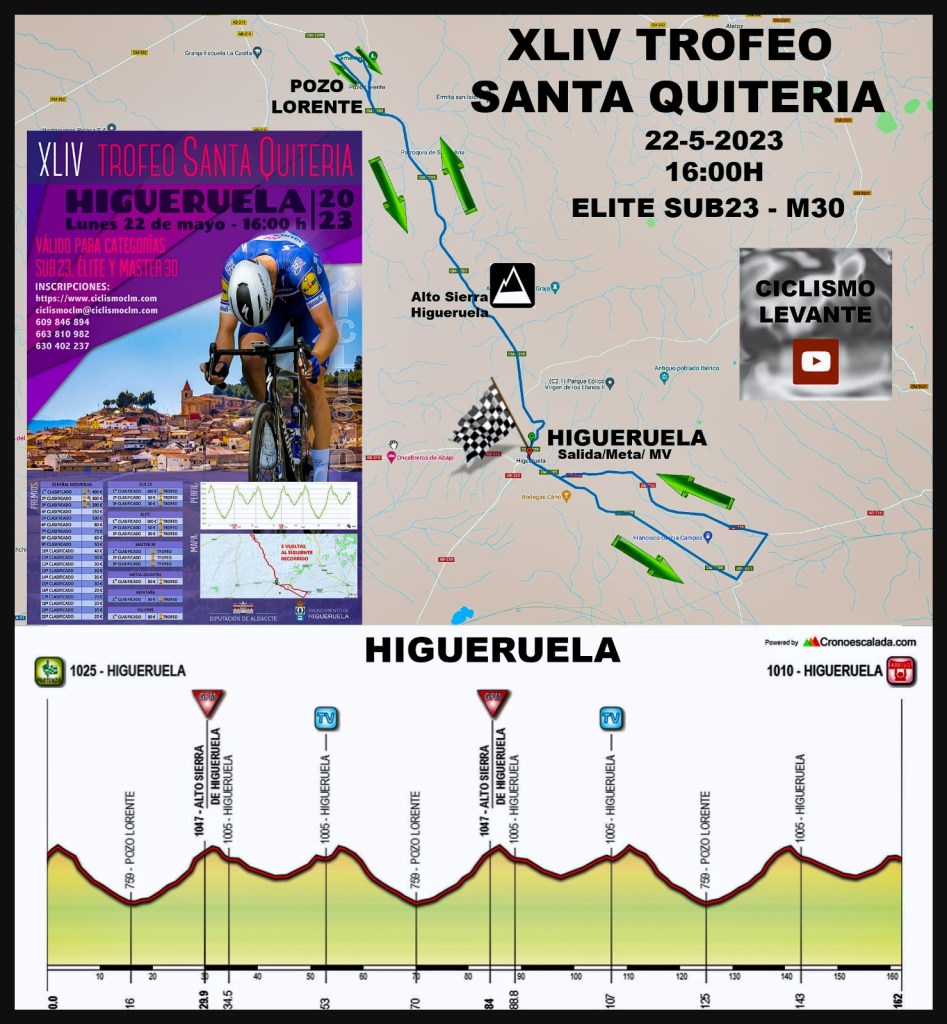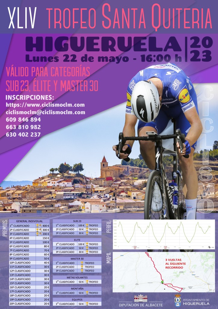 Esta tarde se disputa en Higueruela el XLIV Trofeo San Quiteria, una de las pruebas decanas del ciclismo de Castilla-La Mancha. La carrera, dirigida a las categorías sub23, élite y máster 30, comienza a las 16 horas y está organizada por el Ayuntamiento de la localidad con la colaboración del club GSPORT-T3SCC y la Diputación de Albacete, en el marco de sus fiestas patronales.