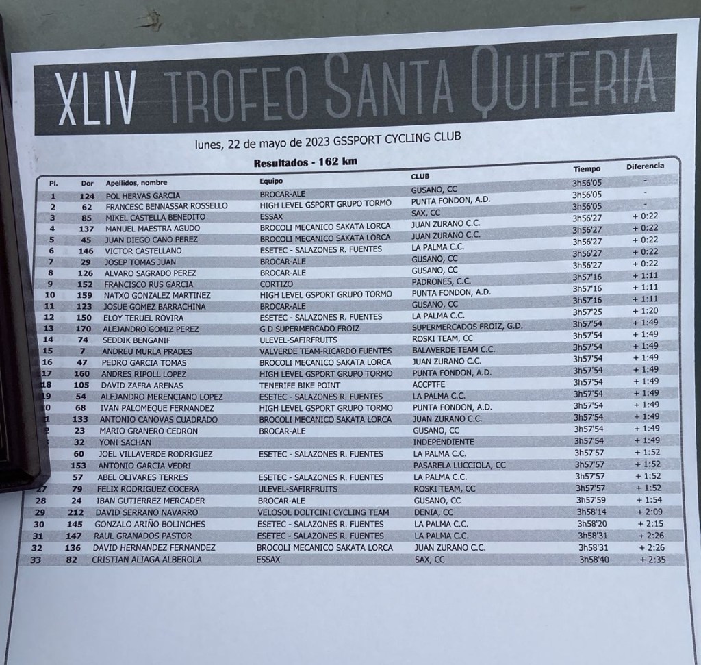 Pol Hervás (Brocar Alé) se ha impuesto al esprint esta tarde en Higueruela en el XLIV Trofeo San Quiteria, una de las pruebas decanas del ciclismo de Castilla-La Mancha. El alcoyano ha superado a Francesc Bennassar (High Level-Gsport) y a Mikel Castella (Essax). Óscar Moscardó (Essax) se ha llevado la montaña. Las metas volantes han sido para Víctor Castellano (Esetec Salazones Ricardo Fuentes). David Serrano (Velosol) logra la victoria entre los M30. El mejor equipo ha sido el Brocar Alé, que ha metido también en el Top 11 a Josep Tomàs, Álvaro Sagrado y Josué Gómez. Hoy ha dirigido desde el coche, era su debut en solitario, Andrés Pascual.
