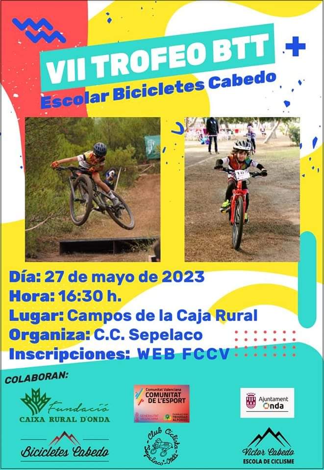 El sábado, día 27 de mayo, se disputa en Onda el VII Trofeo BTT Escolar Bicicletas Cabedo, la última prueba del Open BTT de Escuelas de CV. La prueba está organizada por el CC Sepelaco y en el cartel que han diseñado para este competición aparecen dos fotos del corredor local Álex García Bagan. Entre una y otra imagen hay nada más y nada menos que siete años de diferencia y en el camino la progresión de un chaval que ha sido capaz de superarse hasta llegar a ser un excelente biker en su categoría.