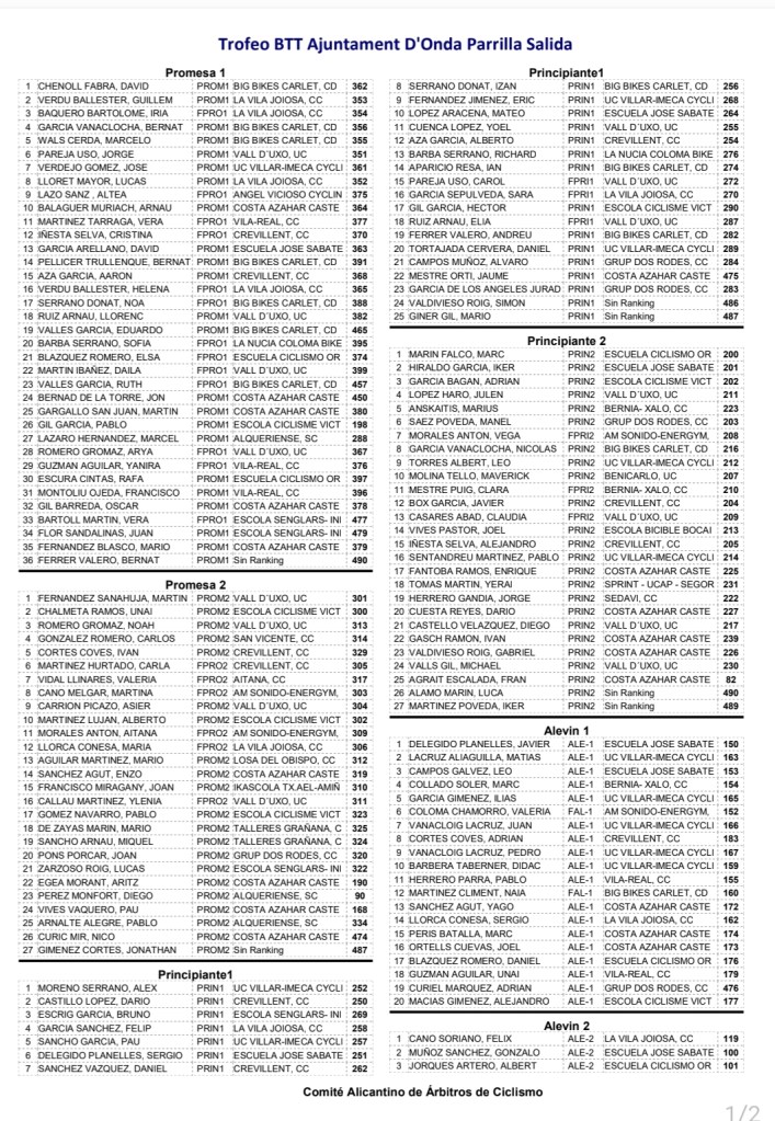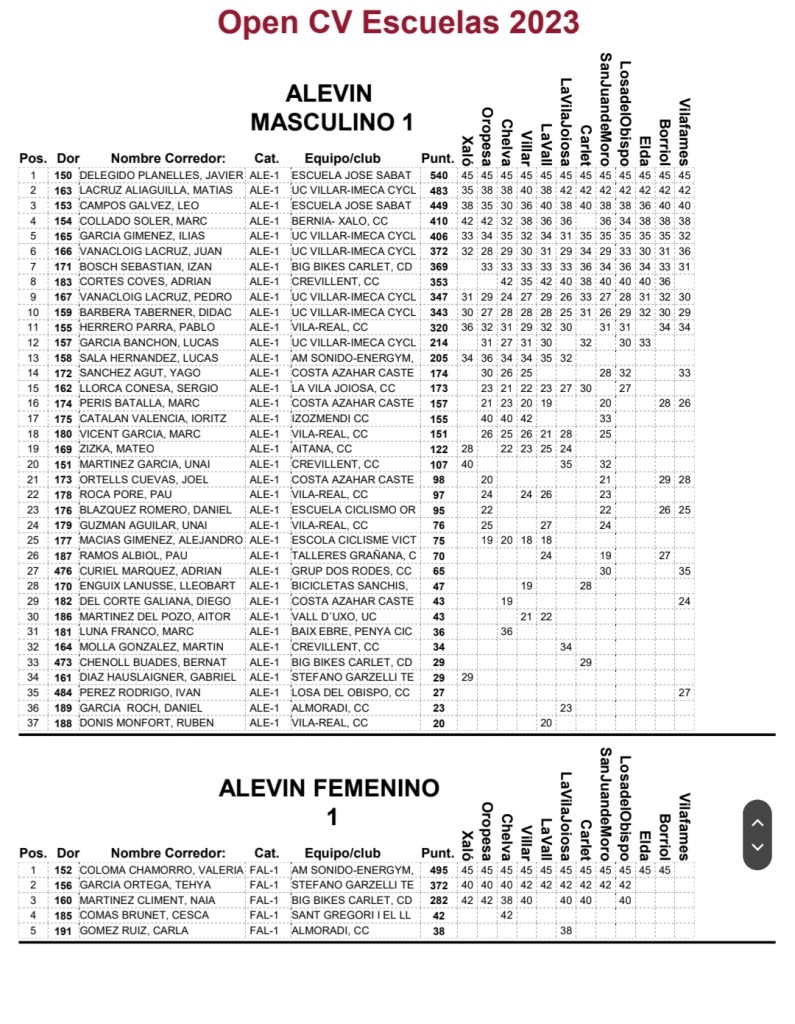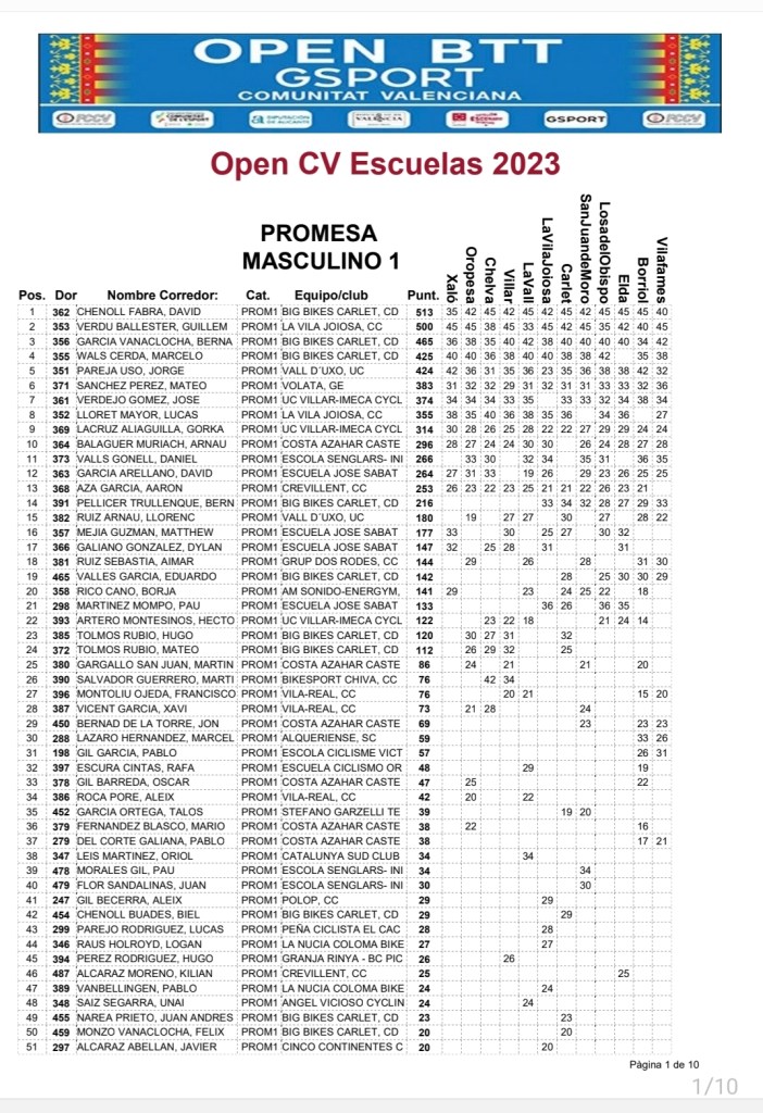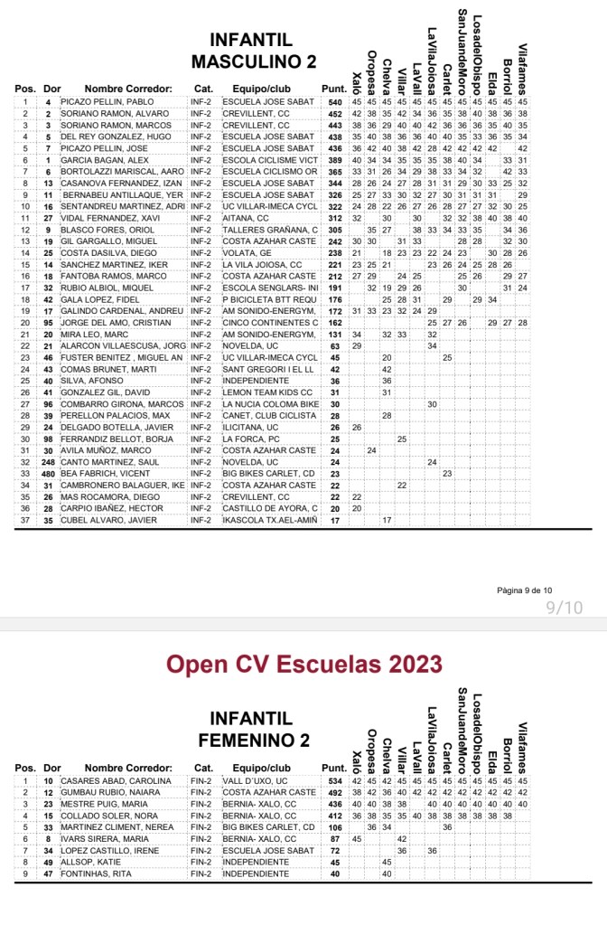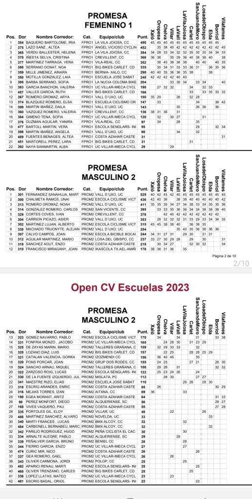 Llegan como líderes a la última jornada del Open David Chenoll (Big Bikes) y Iria Baquero (La Vila), en Promesas 1; Martín Fernández (Vall d’Uixó) y Carla Martínez (Crevillent), en Promesas 2; Álex Moreno (UC Villar) y Carol Pareja (Vall d’Uixó), en Principiantes 1; Marc Marín (Orbel) y Vega Morales (AM Sonido), en Principiantes 2; Javier Delegido (Escuela José Sabater) y Valeria Coloma (AM Sonido), en Alevines 1; Gonzalo Muñoz (Escuela José Sabater) y Ainhoa Cano (AM Sonido), en Alevines 2; Álex Beltrán (Grupo Dos Rodes) y Leire López (Vall d’Uixó), en Infantiles 1; y Pablo Picazo (Escuela José Sabater) y Carolina Casares (Vall d’Uixó), en Infantiles 2.