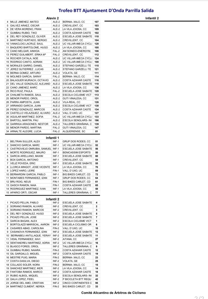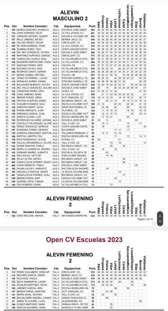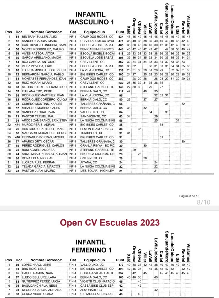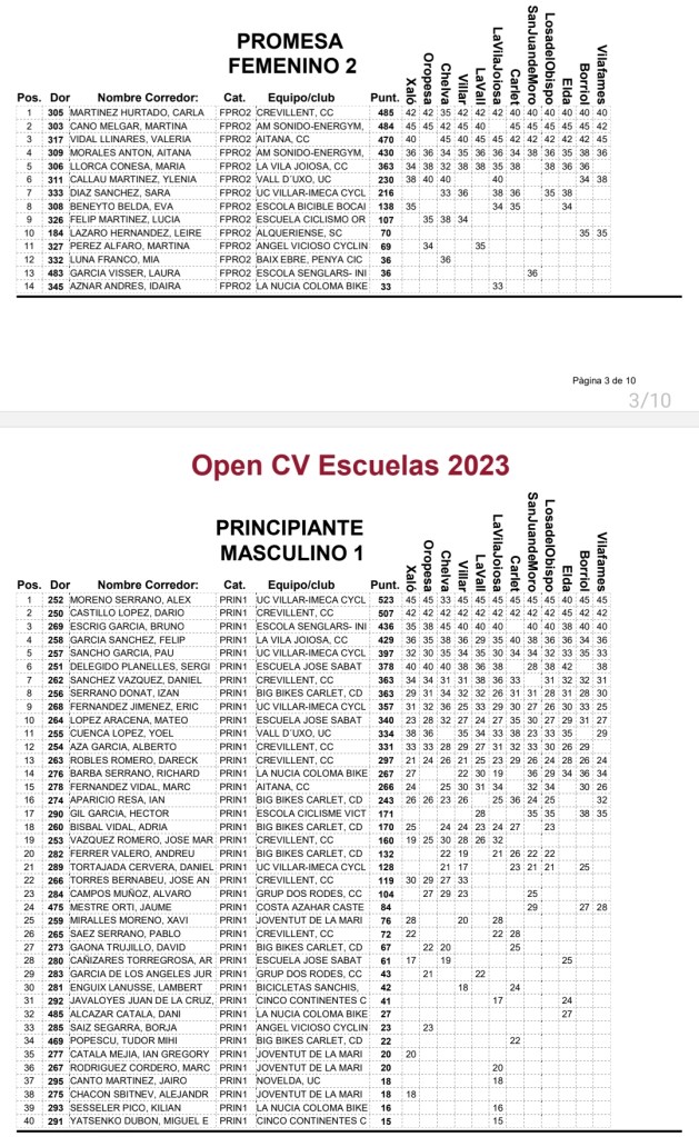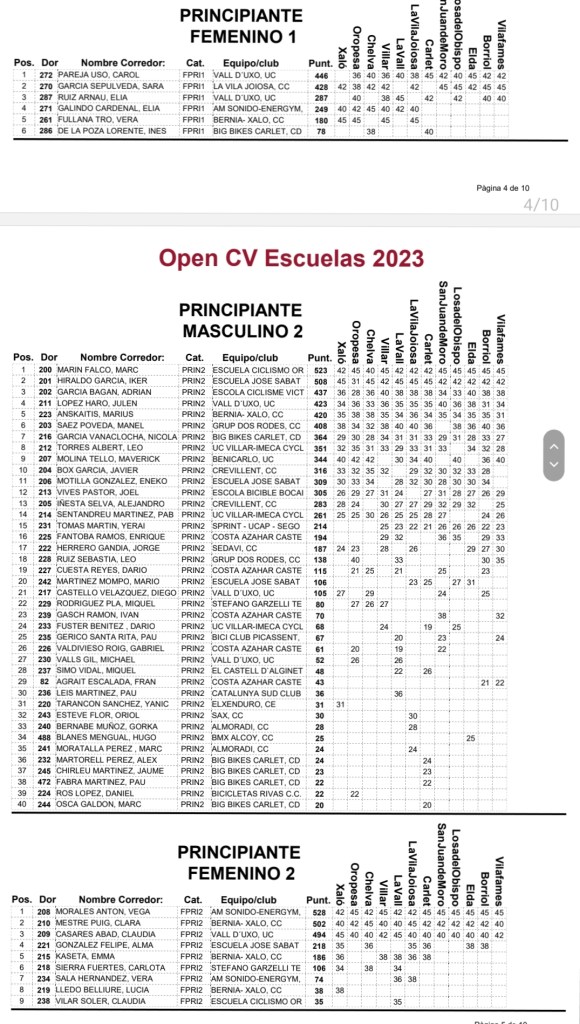 Llegan como líderes a la última jornada del Open David Chenoll (Big Bikes) y Iria Baquero (La Vila), en Promesas 1; Martín Fernández (Vall d’Uixó) y Carla Martínez (Crevillent), en Promesas 2; Álex Moreno (UC Villar) y Carol Pareja (Vall d’Uixó), en Principiantes 1; Marc Marín (Orbel) y Vega Morales (AM Sonido), en Principiantes 2; Javier Delegido (Escuela José Sabater) y Valeria Coloma (AM Sonido), en Alevines 1; Gonzalo Muñoz (Escuela José Sabater) y Ainhoa Cano (AM Sonido), en Alevines 2; Álex Beltrán (Grupo Dos Rodes) y Leire López (Vall d’Uixó), en Infantiles 1; y Pablo Picazo (Escuela José Sabater) y Carolina Casares (Vall d’Uixó), en Infantiles 2.
