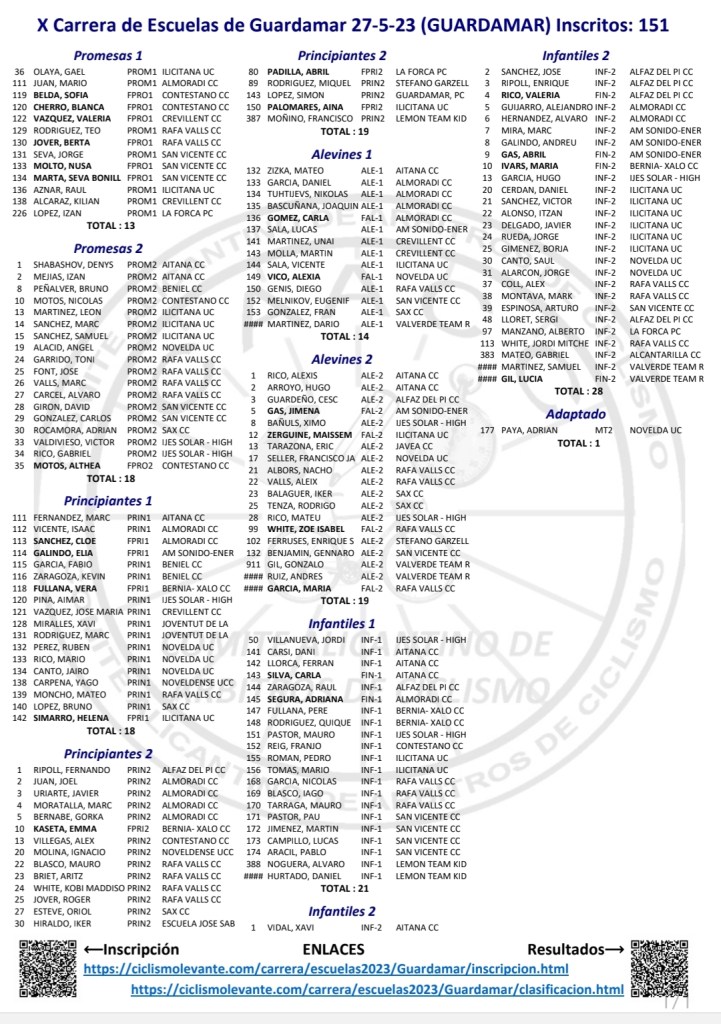 Llegan como líderes a la octava prueba de la Challenge de Escuelas de la provincia de Alicante Gael Olaya (UC Ilicitana) y Sofía Belda (Contestano), en Promesas 1; Izan Mejías (Aitana) y Valeria Vidal (Aitana), en Promesas 2; Marc Fernández (Aitana) y Vera Fullana (Bernia Xaló), en Principiantes 1; Marc Moratalla (Almoradí) y Aina Palomares (Ilicitana), en Principiantes 2; Eugeni Melnikov y Alexia Vico (Novelda), en Alevines 1; Nacho Albors (CC Rafa Valls) y Jimena Gas (AM Sonido), en Alevines 2; Mauro Pastor (Ijes Solar) y Adriana Segura (Almoradí), en Infantiles 1; Jorge Rueda (UC Ilicitana) y María Ivars (Bernia Xaló), en Infantiles 2; y Adrián Payá (Novelda), en Adaptado MT2.