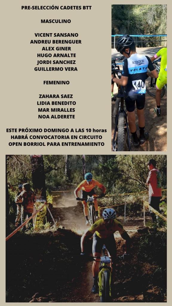 La preselección de cadetes de BTT de la FCCV se reunirán el próximo domingo en Borriol para realizar un entrenamiento preparatorio para el Campeonato de España de Cartagena. Estas citados por Blanca García Vicent Sansano, Andreu Berenguer, Álex Giner, Hugo Arnalte, Jordi Sánchez y Guillermo Vera, de categoría masculina, y, Zahara Sáez, Lidia Benedito, Mar Miralles y Noa Alderete, de la femenina.