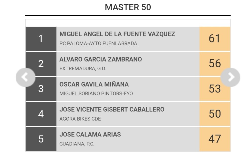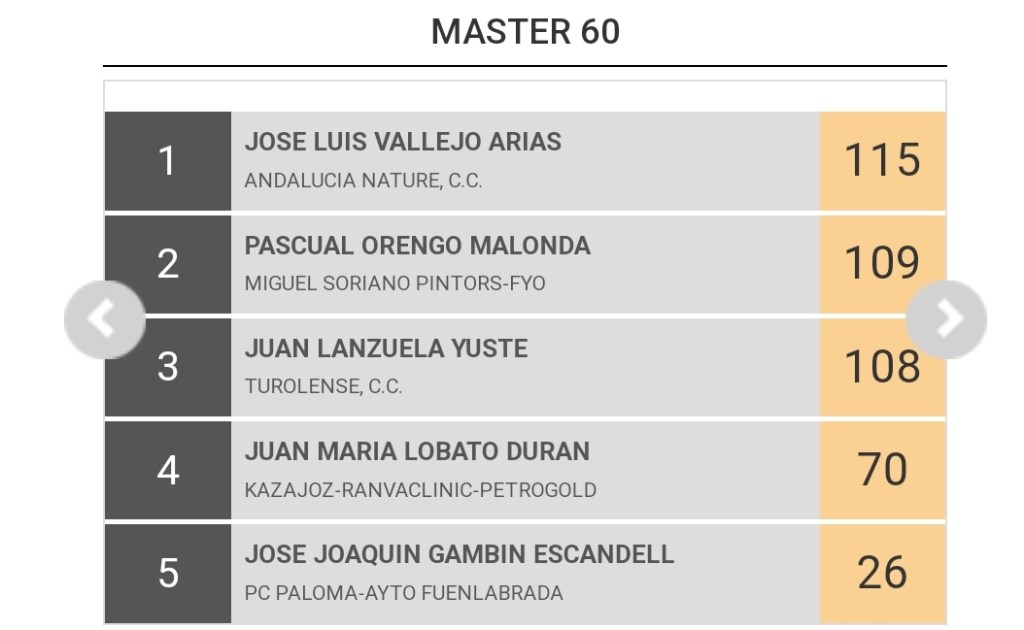 Pascual Orengo Malonda (Miguel Soriano Pintors-FYO) es segundo en la clasificación M60, con 109 puntos, seis menos que el líder; mientras que su compañero de escuadra Óscar Gávila es tercero, con 53 puntos, ocho menos que Miguel Ángel De la Fuente, que comanda a la categoría Máster. También se pondrá el dorsal José Manuel Martínez Bevia.