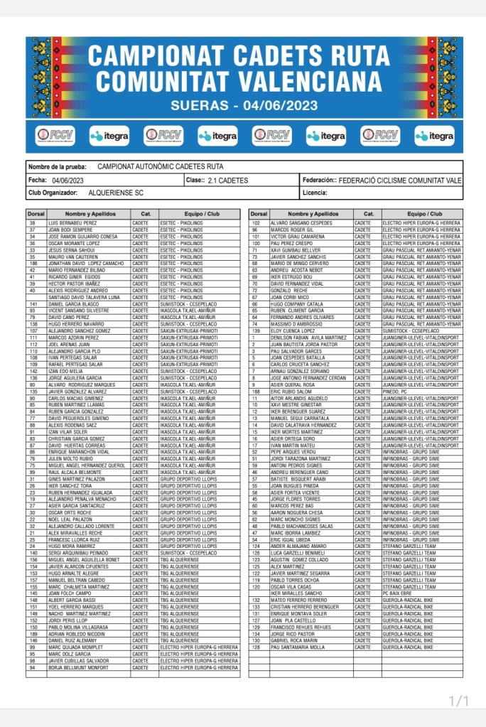 El próximo domingo, día 4 de junio, se celebra en la localidad castellonense de Sueras el Campeonato Autonómico de Cadetes. Héctor Álvarez logró el título en la edición de 2022. Óscar Orts y Oleg Melnikov completaron el podio en un prueba que se disputó en La Pobla Llarga.