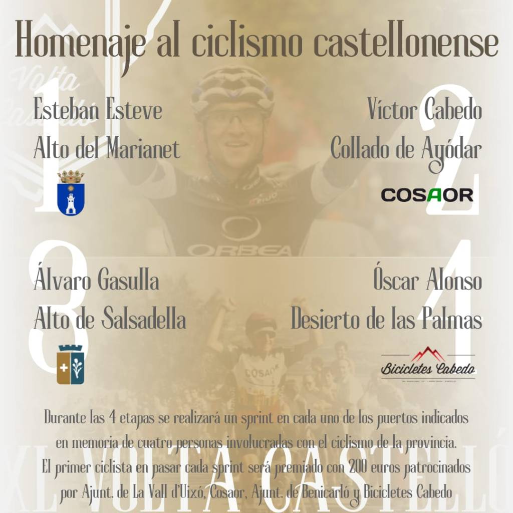 En concreto, la primera etapa tendrá como premio especial el paso por el Alto del Marianet gracias al patrocinio del ayuntamiento de La Vall d’Uixó y como homenaje a Esteban Esteve, ciclista amateur de la localidad. En la segunda jornada, el premio corresponderá al ciclista que pase en primera posición por el Collado de Ayódar, gracias al patrocinio de Cosaor y en homenaje al malogrado Víctor Cabedo. El tercer día, en la exigente etapa por el norte de la provincia, el premio especial corresponde al Alto de Salsadella gracias al patrocinio del ayuntamiento de Benicarló y en homenaje a Álvaro Gasulla, ciclista amateur de la localidad y gran impulsor del ciclismo en su región. La etapa final con salida y meta en el Grau de Castelló tiene situado este premio especial al paso por el Alto Desierto de las Palmas, gracias al patrocinio de Bicicletes Cabedo y como homenaje a Óscar Alonso, agente de la Guardia Civil que falleció recientemente.