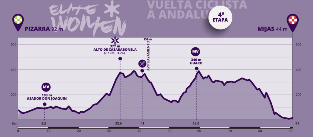La Vuelta a Andalucía Élite Women continuará este sábado con la disputa de su cuarta y penúltima etapa, de 111,5 kilómetros y que enlazará las localidades malagueñas de Pizarra y Mijas.