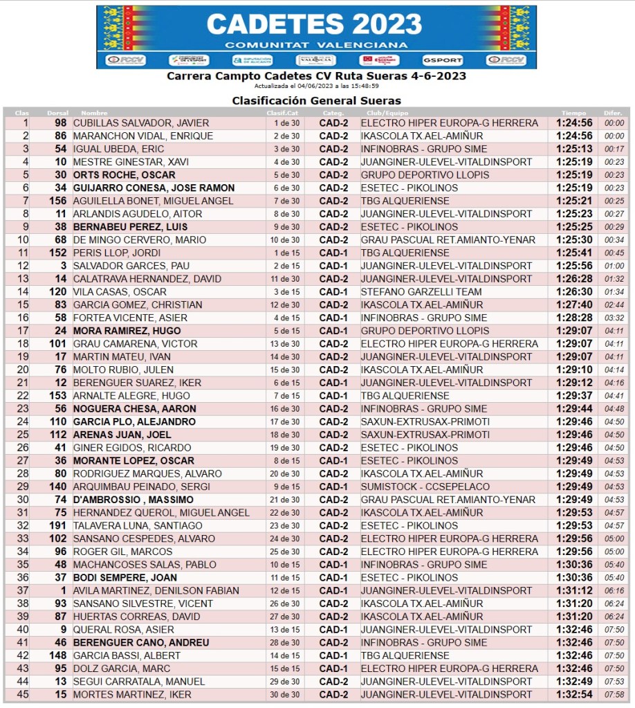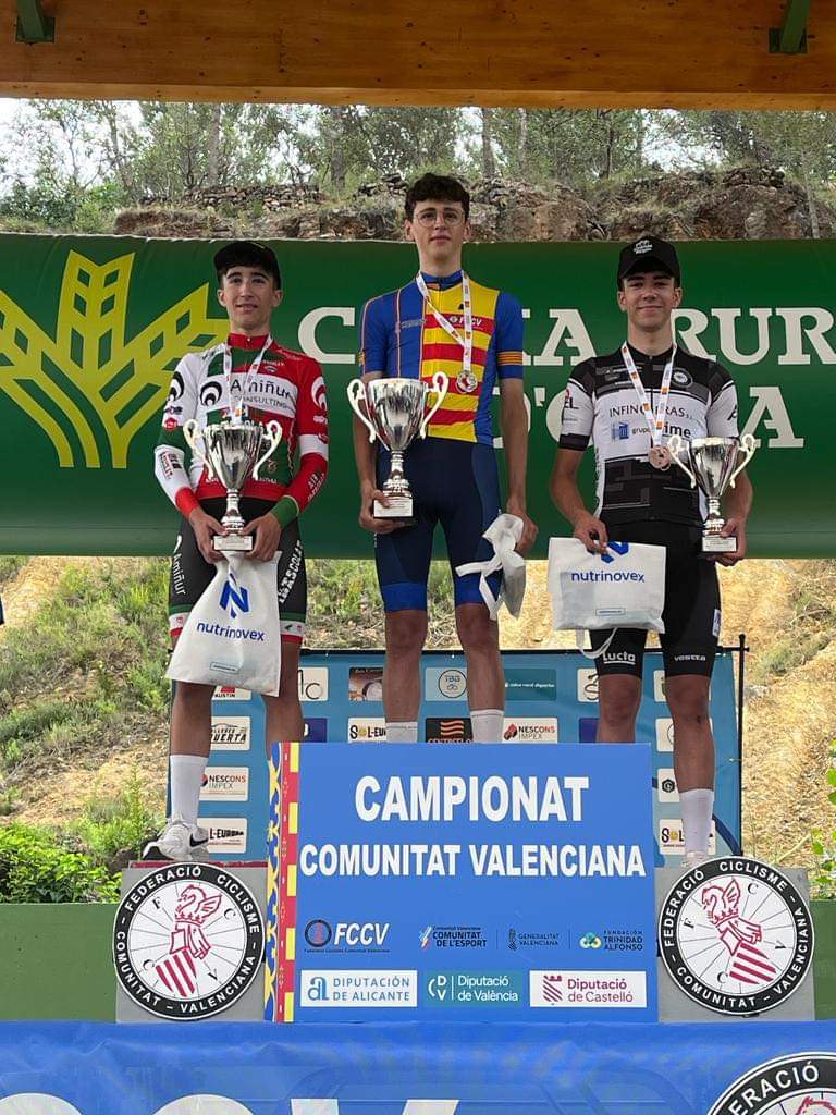 y Eric Igual (Infinobras-Grupo Sime) le han acompañado en el podio. Después de un intenso recorrido con una meta explosiva en Sueras Javier Cubillas ha logrado vestir el maillot autonómico sustituyendo a Héctor Álvarez, que lo llevaba en el último año. Perfecta la organización del CC Alqueriense, que está celebrando su 75 aniversario. El presidente de la Diputación de Castellón, Jose Martí, el alcalde de Tales, Vicente Juan; y la representante de la FCCV, Carmela Rufanges han estado en la carrera ademas del aparte del técnico de la Federación Ángel Alfaro.