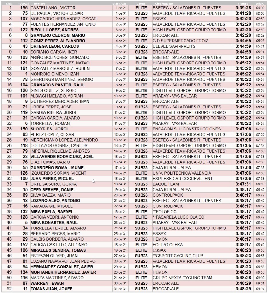 Moscardó ha estado acompañado en el podio élite por Andrés Ripoll (High Level-Gsport) y Alejandro Gómiz (Froiz). Y Granero, por Carlos Ortega (Ulevel Safir Fruits) y de Iker Soriano (Brocar Alé).