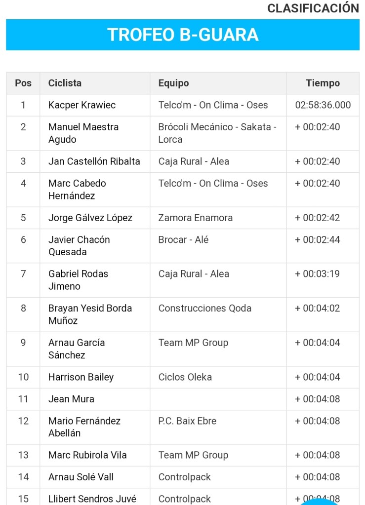 Por detrás, Marc Cabedo ha actuado de secante en todos los movimientos que se producían en una magnífica labor de equipo. El castellonense ha llegado a rodar junto a otro corredor a escasos 40 segundos de Krawiec, pero finalmente las diferencias se han aumentado y han sido neutralizados por un pequeño grupo perseguidor. Con la etapa y la clasificación en el bolsillo, el polaco cruzaba la línea de meta demostrando su gran estado de forma. Marc Cabedo ha terminado cuarto y Javier Chacón (Brocar Alé), sexto.