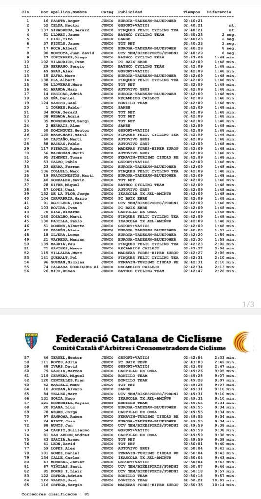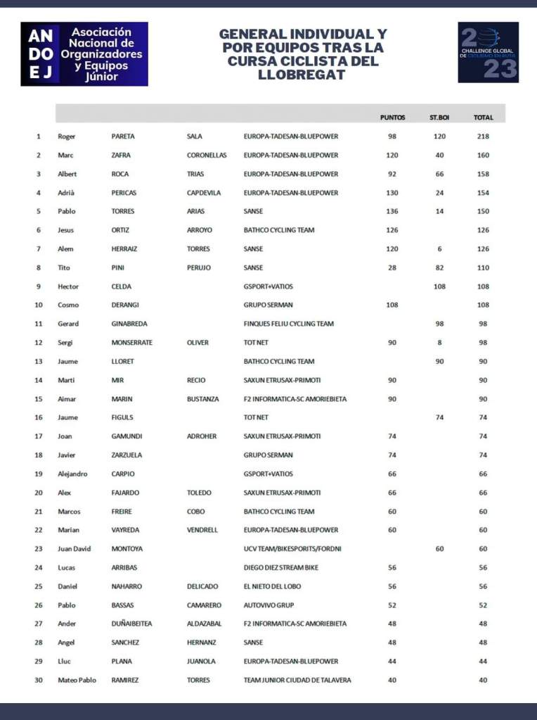 Con la victoria, Pareta también se sitúa como líder general de la Challenge Global de Ciclismo en Ruta y toma el jersey que en esta carrera vistió Pablo Torres (Sanse). Pareta, además, se adjudicó las clasificaciones de las metas volantes, de mejor catalán y la clasificación por equipos. La de la montaña fue p ara Tito Pini y la de mejor júnior de primer año Gerard Ginabreda.