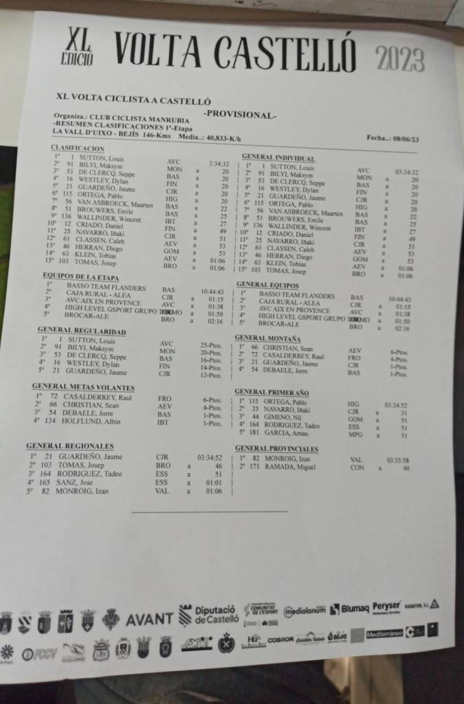 Louis Sutton (AVC Aix en Provence) se ha impuesto en la primera etapa de la Volta Castelló que ha tenido salida en Vall d’Uixó y terminado en Bejís, tras 146 kilómetro de recorrido. El excorredor de Brocar Alé ha entrado en solitario en meta y se ha vestido de líder. Maksym Bilyi (Mónaco) ha sido segundo y Seppe De Clerc (Basson Team), tercero. Jaume Guardeño (Filial Caja Rural) ha sido quinto y primero de la Comunidad. Puesto 15 para Josep Tomàs (Brocar Alé).