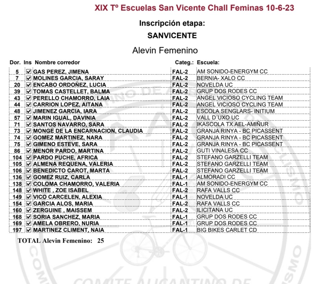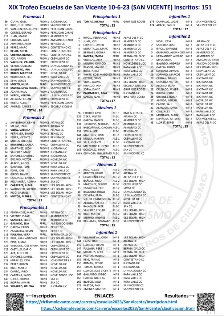Llegan a San Vicente como líderes de la Challenge de Escuelas Gael Olaya (UC Contestano) y Sofía Belda (CC Contestano), en Promesas 1; Izan Mejías (Aitana) y Valeria Vidal (Aitana), en Promesas 2; Marc Fernández (Aitana) y Vera Fullana (Bernia Xaló), en Principiantes 1; Iker Hiraldo (Escuela José Sabater) y Aina Palomares (UC Ilicitana), en Principiantes 2; Eugeni Melnikov (CC San Vicente) y Carla Gómez (Almoradí), en Alevines 1; Nacho Albors (CC Rafa Valls) y Jimena Gas (AM Sonido), en Alevines 2; Mauro Pastor (Ijes Solar) y Adriana Segura (Almoradí), en Infantiles 1; Jordi Mitchell White (CC Rafa Valls) y María Ivars (Bernia Xaló), en Infantiles 2; y Adrián Payá (Novelda), con Adaptado MT2. En total son 151 los inscritos.
