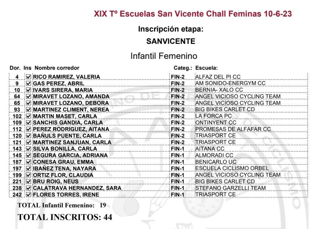 Liga de Féminas vivirá también el sábado en San Vicente su cuarta jornada. Tras las pruebas de Vall d’Uixó, La Vila y Alfafar son líderes Valeria Coloma (AM Sonido), en Alevines 1; Marta Benedicto (Stefano Garzelli), en Alevines 2; Sara Calatrava (Stefano Garzelli), en Infantiles 1; y Carla Bañuls (Triasport), en Infantiles 2. En Gymkhana, lideran la prueba Carla Gómez (Almoradí), en Alevines 1; Balma Tomás (Grupo Dos Rodes), en Alevines 2; Adriana Segura (Almoradí), en Infantiles 1; y Carls Bañuls (Triasport), en Infantiles 2. Por escuadras domina el Stefano Garzelli. Hay inscritas 44 corredoras, 25 alevines y 19 infantiles.