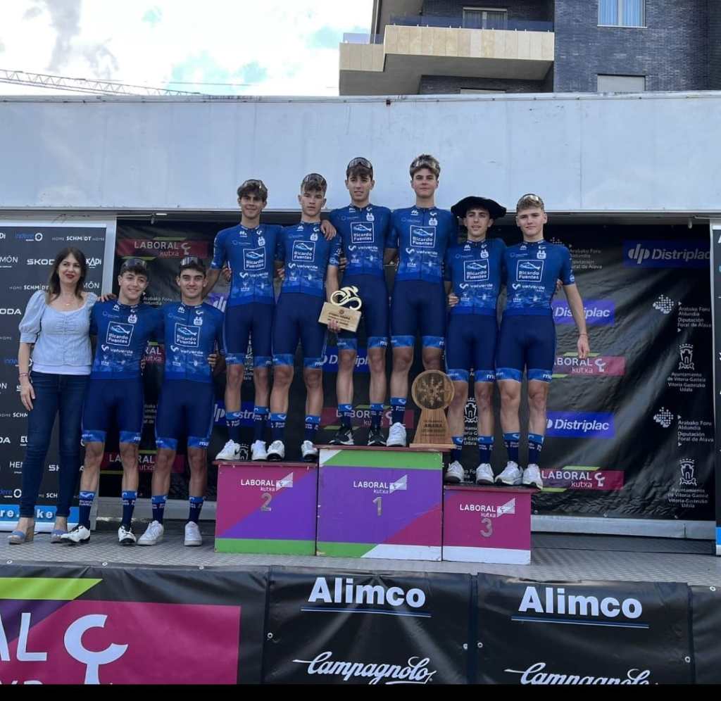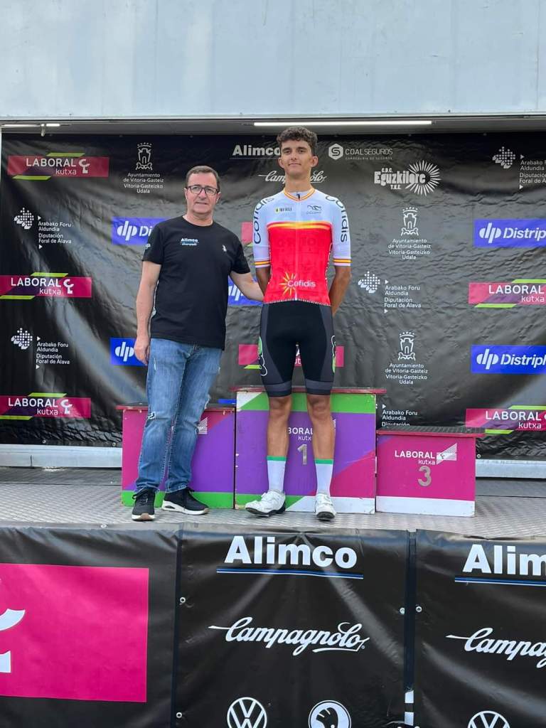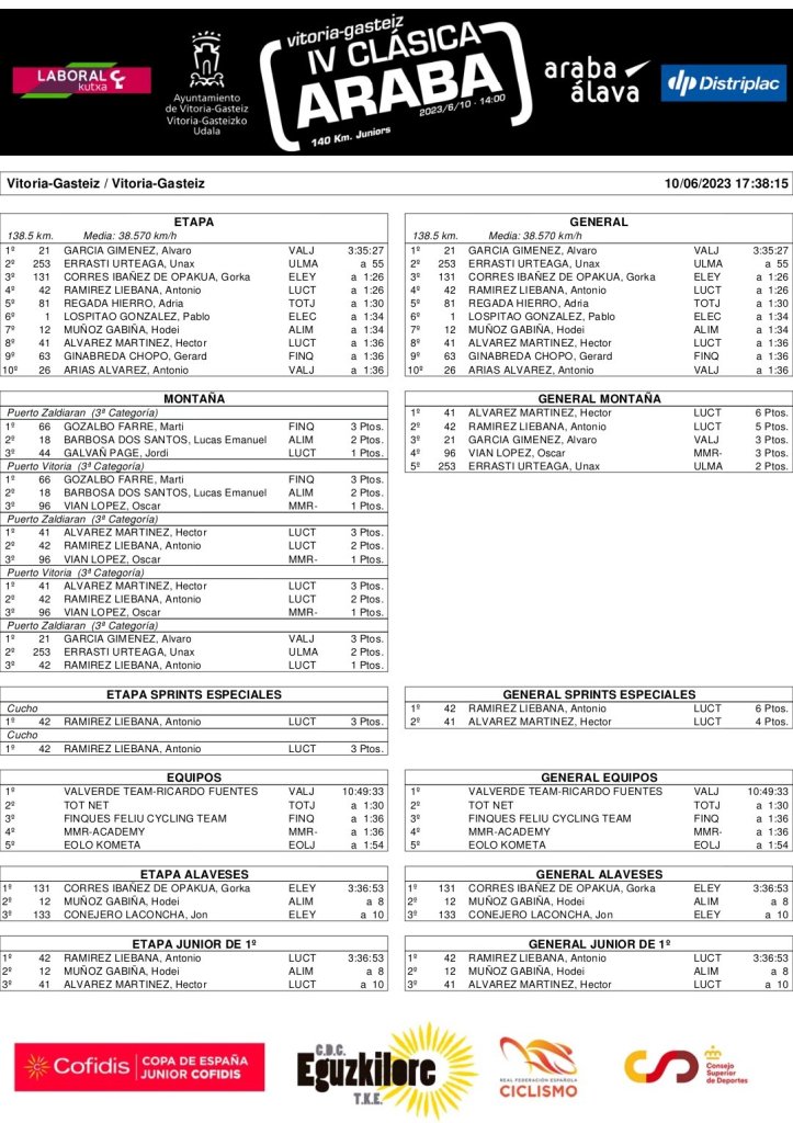 Álvaro García (Valverde Team – Ricardo Fuentes) ha ganado hoy en solitario en la IV Clásica Araba Vitoria-Gasteiz disputada sobre un recorrido de 138,5 kilómetros. La segunda posición ha sido para Unax Errasti y la tercera para Gorka Corres. Antonio Ramírez (Lucta Grupo Sime) ha finalizado cuarto y primer joven y su compañero de escuadra Héctor Álvarez, octavo. Ambos estuvieron escapados durante una parte de la carrera junto a Óscar Vian (MMR). De esta forma, Antonio se ha adjudicado los Sprint Especiales y Héctor, la montaña Pablo Lospitao, sexto en el día de hoy, conserva el liderato en la Copa de España Júnior. Buen trabajo de equipo de Mateo Matey (Valverde Team). Un compañero ha ganado y se han impuesto por escuadras.