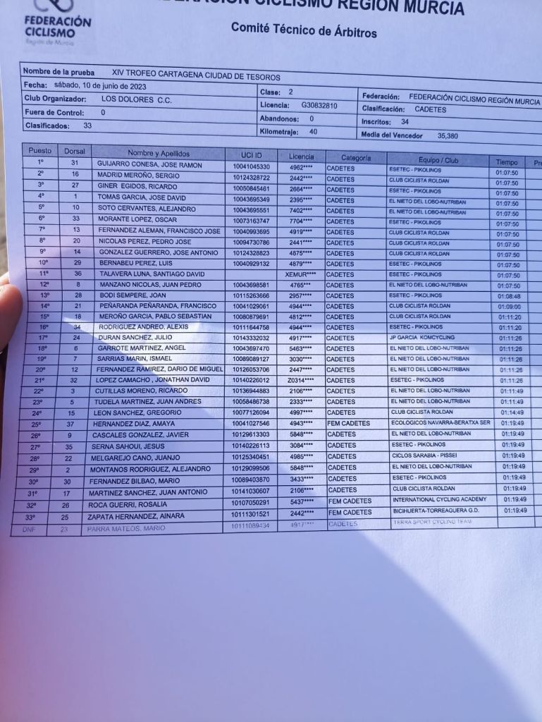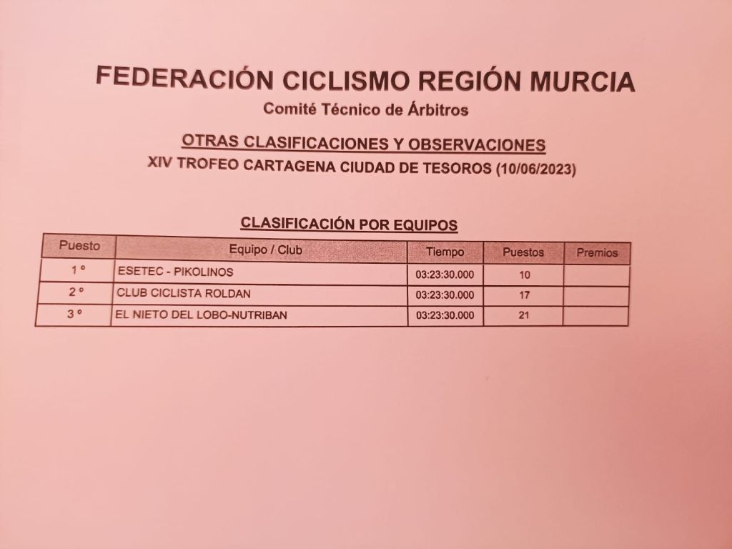 José Ramón Guijarro (Esetec Pikolinos) se ha impuesto al esprint en el XIV Trofeo Cartagena-Ciudad de Tesoros para corredores cadetes que se ha disputado hoy en tierras murcianas. Sergio Madrid (CC Roldán) termina segundo y Ricardo Giner (Esetec Pikolinos) ha completado el podio. La escuadra de la Unión Ciclista Ilicitana ha sido protagonista en la prueba ya que ha metido también en el Top 10 a Óscar Morante (6º) y Luis Bernabéu (10º) y ha ganado por escuadras. Además, Bernabéu ha viajado en la escapada de la jornada junto a Guijarro, pero han sido atrapados a dos vueltas del final, y Morante se ha adjudicado las metas volantes.