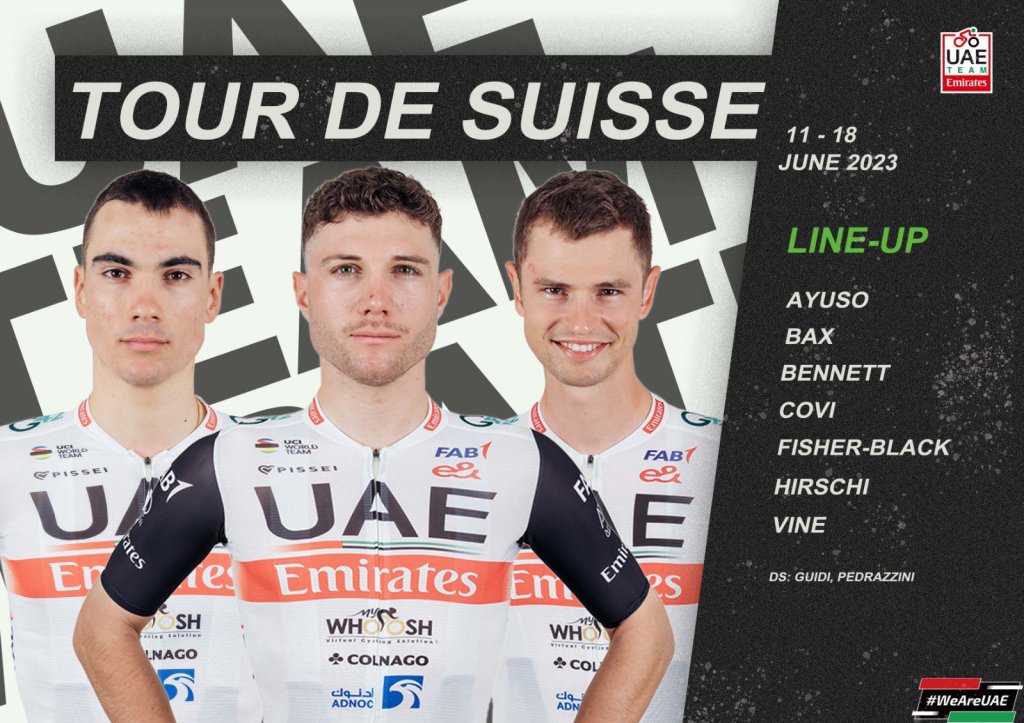 Juan Ayuso será el líder del UAE Team Emirates en la Vuelta a Suiza que se disputa desde del 11 hasta el 18 de junio. El xabiense estará acompañado por Sjoerd Bax, Alessandro Covi, Marc Hirschi, George Bennett, Finn Fisher Black y Jay Vine. Para Ayuso será la segunda carrera de la temporada. Tras perderse la primera parte del ejercicio por una lesión en el tendón, debutó a finales de abril en Tour de Romandía, prueba en la que enfundó el maillot amarillo tras ganar la contrarreloj en Châtel-Saint-Denis. Al día siguiente cedió la preciada túnica a su compañero Adam Yates en la subida a Thyon 2000.