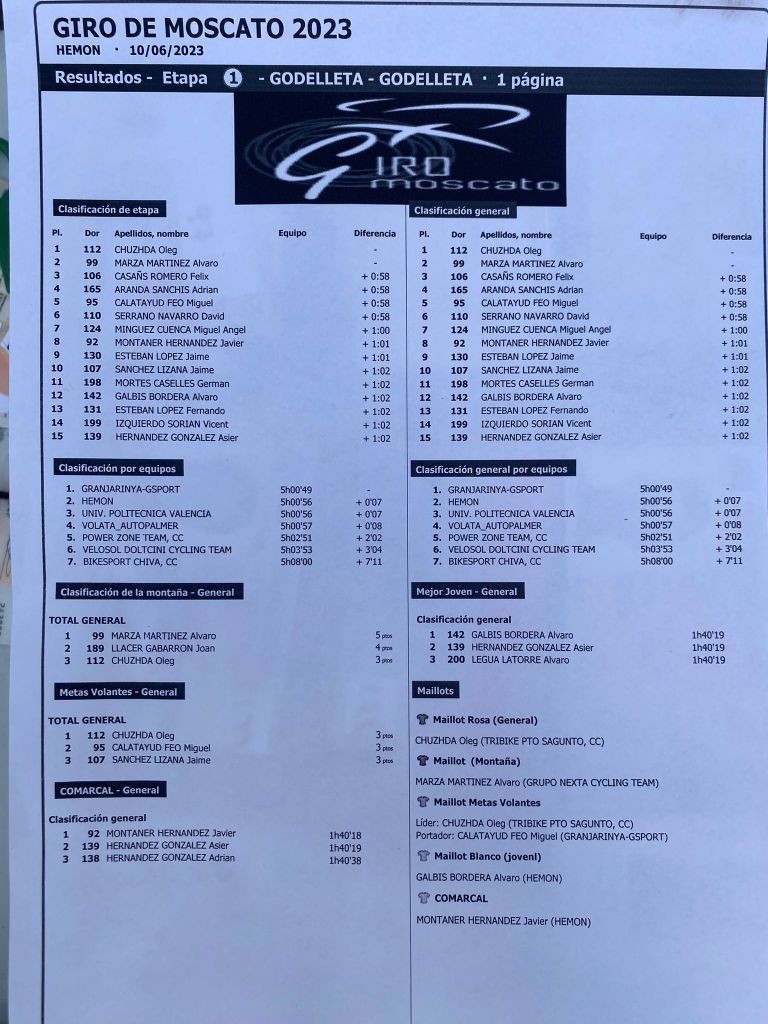 Oleg Chuzhda (Tribike) ha sido el ganador de la primera etapa del Giro Moscato que ha tenido salida y meta en Godelleta, tras 66 kilómetros de recorrido. El ganador ha entrado en meta acompañado de Álvaro Marza. A 58 segundos han llegado Félix Casas, Adrián Aranda y Miguel Calatayud.