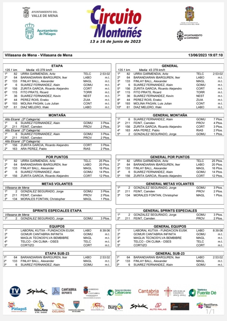 Aritz Urra (Telcom) ha sido el ganador de la primera etapa del Circuito Montañés que ha tenido salida y meta en Villasana de Mena y 125,1 kilómetros de recorrido. Iker Barandiarán (Laboral Kutsa Team) y Alexander Finlay (Maglia) han completado el podio. Alain Suárez es el líder de la montaña, Jorge González de las metas volantes y los sprints especiales y el Laboral Kutxa la mejor escuadra.