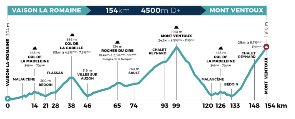 La clásica francesa Mont Ventoux es una prueba 1.ProSeries que en principio iba a tener 154 kilómetros, 4.500 metros de desnivel pero se ha recortado por las tormentas y riesgos de riadas. Pasa a tener 98,3 kilómetros, con sólo una vertiente del Ventoux, la de Sault (24 km. al 5%), como meta. Tomarán la salida todos los equipos españoles, es decir, Movistar, Burgos, Caja Rural, Euskaltel, Kern Pharma y el continental Electro Híper Europa.