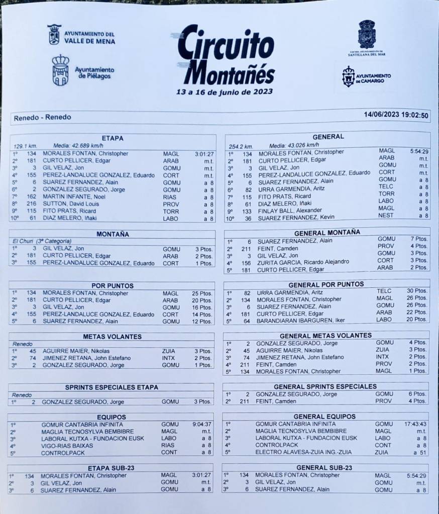 Christopher Morales (Maglia Team) se ha impuesto hoy en Renedo en la segunda etapa del Circuito Montañés y se ha vestido de líder. Ha entrado en meta acompañado de Edgar Curto (Arabay), Jon Gil (Gomur) y Eduardo Pérez-Landaluce (Cortizo). A ocho segundos llegó el pelotón a 8 segundos encabezado por Alain Suárez (Gomur), que lidera el premio de la montaña. Aritz Urra (Telcom) lleva el maillot de los puntos y Jorge González (Gomur) lidera las metas volantes y los sprint especiales.