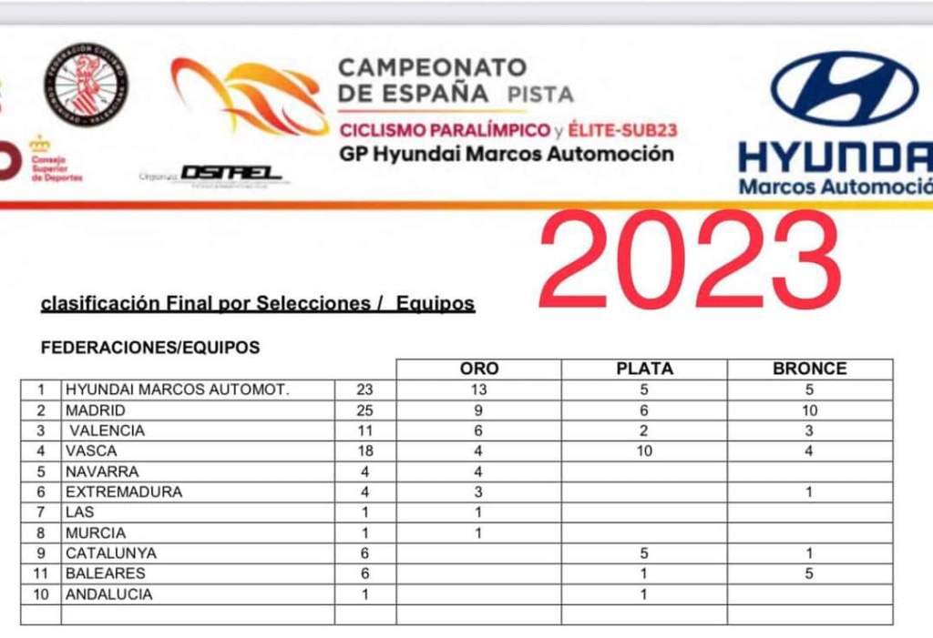 El Campeonato de España de Pista Paralímpico y Élite-Sub 23 disputado en València ha dejado un buen sabor de boca. El trabajo que se está realizando con el ciclismo adaptado ha dado sus frutos y mientras el equipo Hyundai Marcos Automoción ha sido el mejor tras cosechar 13 medallas de oro, cinco de platas y otras cinco de bronce, la Selección de la FCCV que dirige Vicent Perales no sólo ha sumado once medallas (Seis de oro, dos de plata y tres de bronce) si no que también ha sido capaz de aumentar el número de participantes en las distintas pruebas y de demostrar un sentimiento de equipo que lleva a pensar que el futuro es suyo con semejantes «brotes verdes». En 2021 sólo tan solo participó un seleccionado y se lograron tres medallas. En la edición de 2022 no hubo representación y en la última han sido seis los pistards que han lucido el maillot de la Selección de la Comunidad Valenciana. La comisión de ciclismo paralímpico, que está formada por Vicent Perales Martínez, Ruth Aguilar, Pablo Estrela, Pascual Orengo Lopez y Rubén Capdevila Miravet, tiene mucho trabajo por delante, pero se están poniendo las bases para que todo el que desee practicar ciclismo pueda hacerlo sin problemas y con ayuda de la Federación. Ponerse el maillot de la FCCV es ya un orgullo. Un ejemplo, el ejemplo de Rosa Sansaloni. Con cuatro medallas de oro ya en el bolsillo sufrió una caída en el calentamiento antes de participar en el Scratch. A pesar de tener el radio roto saltó a la pista y conquistó su quinta presea.