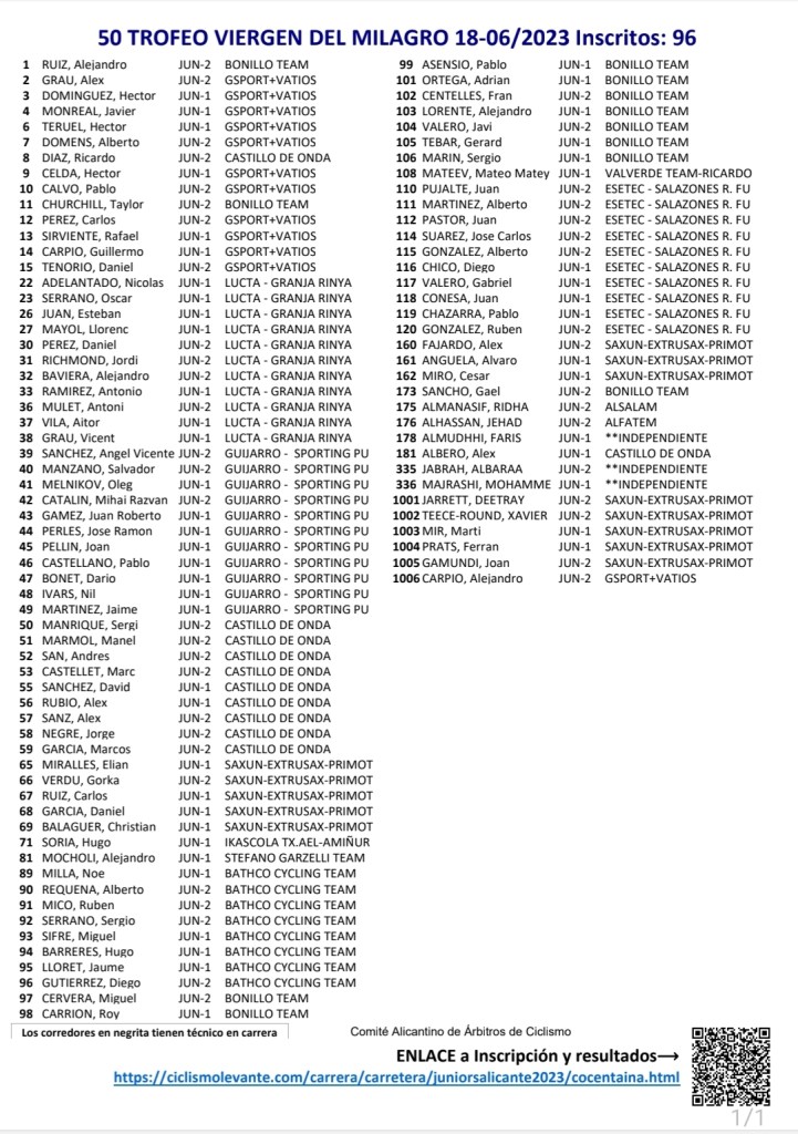 El 50 Trofeo de Ciclismo Virgen de Milagro de Cocentaina contará con 96 participantes y la presencia de los equipos de la categoría júnior de la Comunidad, además de Bathco y el Esetec Salazones Ricardo Fuentes. La carrera diseñada en el Passeig del Comtat de la localidad alicantina se disputará a partir de las 10.30 horas. La prueba se aplazó hace unas semanas ya que el circuito estaba peligroso por los adoquines y la lluvia caída.