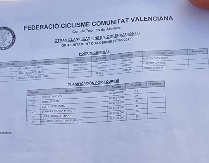 Ricardo Díaz (Castillo de Onda) se ha impuesto hoy en el XII Ajuntament de Algemesí-Trofeu San Onofre. La segunda prueba de la Challenge Comunitat Valenciana Júnior FCCV Itegra ha contado con 76,68 kilómetros de recorrido. Alex Grau (Gsport + Vatios) ha entrado a meta segundo y Gael Sancho (Bonillo), tercero. Taylor Churchill (Bonillo), hoy séptimo, es el nuevo líder de la Challenge.