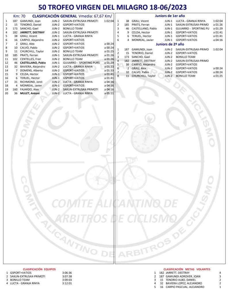 Joan Gamundi (Saxun Extrusax Primoti) se ha impuesto hoy en Cocentaina en el 50 Trofeo Virgen del Milagro para ciclistas júniors organizado por el CC. Contestá. Daniel Tenorio (Gsport +Vatios) se ha clasificado segundo y Gael Sancho (Bonillo Team), tercero. Deetray Jarret se ha llevado las metas volantes y el Gsport +Vatios se ha impuesto por escuadras.