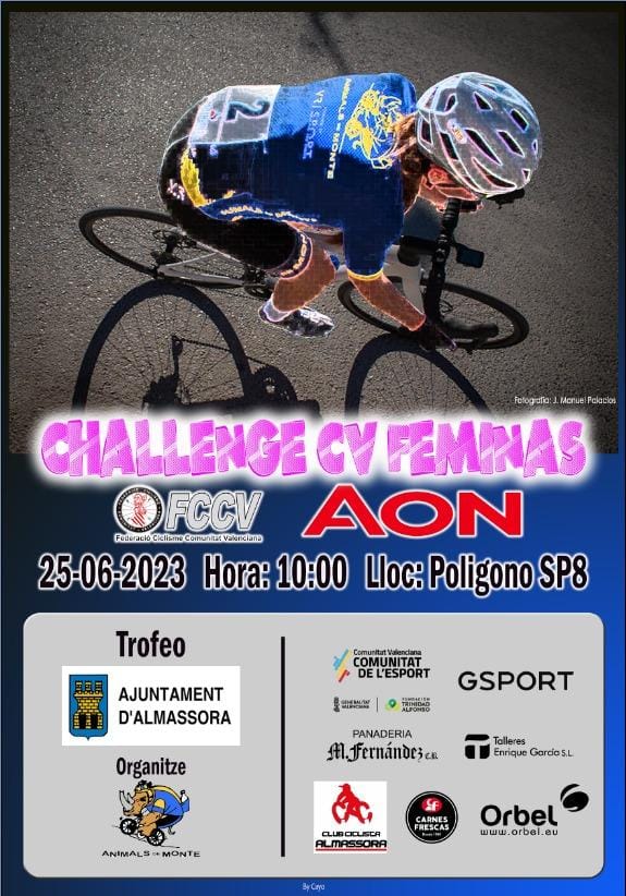 El domingo, día 25 de junio, se disputa el Trofeo Ajuntament d’Almassora, cuarta pureba de la Challenge CV-Féminas Aón. Está organizado por el CC. Animals de Monte y el pelotón partirá a las 10 de la mañana en el polígono SP8. Se ha diseñado un circuito de 4,7 kilómetos. Se realizará una única carrera con dos salidas: La primera, para las categorías Élite, Sub23, Júnior y Máster 30. Y la segunda, a los 20 minutos del inicio, y será para las Máster 40, 50 y 60 y Cadetes.