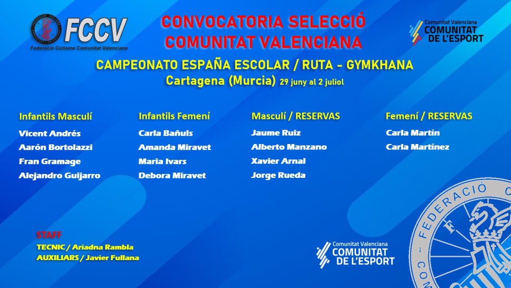 La seleccionadora de Escuelas de la Comunidad Valenciana, Ariadna Rambla, ya ha hecho oficial el combinado autonómico que participará en los Campeonatos de España de la categoría. En la lista aparecen Amanda Miravet, Débora Miravet, Carla Bañuls y María Ivars, en la categoría femenina, y Aarón Bortolazzi, Vicente Andrés, Fran Gramaje y Alejandro Guijarro, en la masculina. Figuran como reservas, Carla Martín, Carla Martínez, Jaume Ruiz, Alberto Manzano, Xabier Arnal y Jorge Rueda.