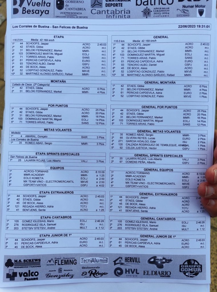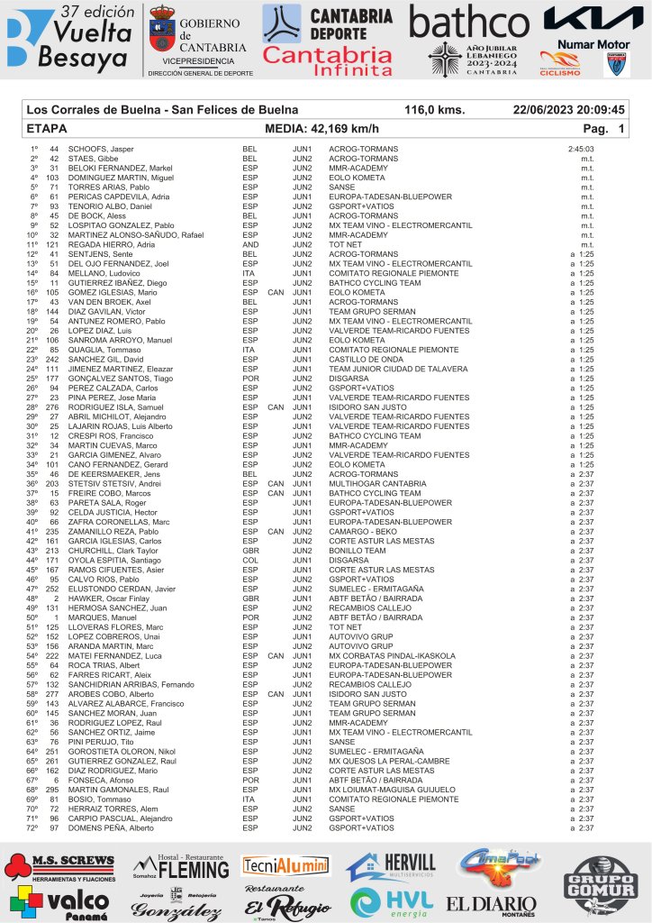 Jasper Schoofs (Acrog-Tormans) ha sido el ganador de la primera etapa de la Vuelta Besaya que ha partido de Los Corrales de Buelna y ha finalizado en San Felices de Buelna, tras 116 kilómetros de recorrido. Once corredores llegaron a meta en el que iban Miguel Domínguez, Adriá Pericas, Dani Tenorio, Rafa Martínez, Markel Beloki, Adriá Regada, Lospitao y tres belgas. Schoofs entró primero y se ha vestido de líder, su compañero de escuadra Gibbe Staes entró segundo, y Markel Beloqui (MMR), tercero.